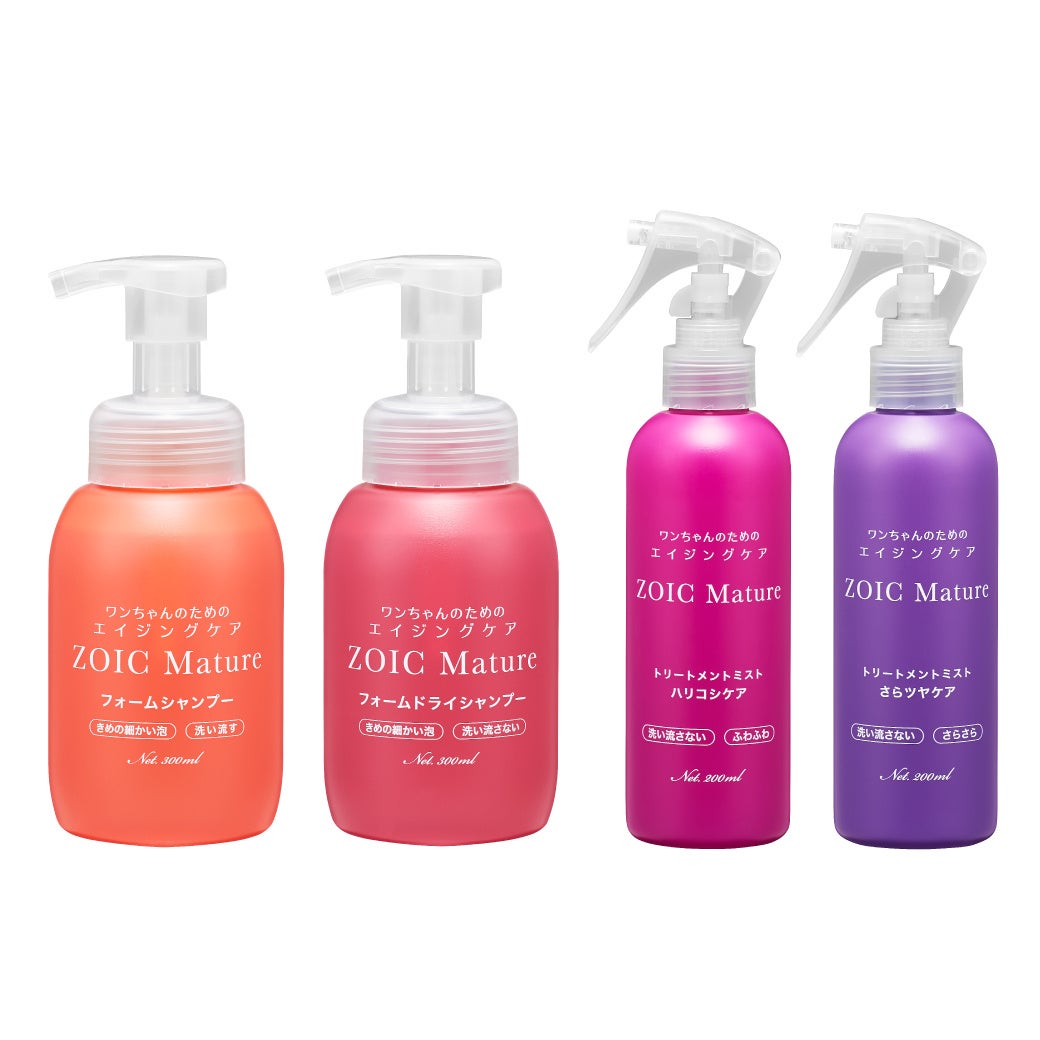 そういった背景の元、シニア犬に対してのシャンプーに重要な要素である「時間短縮」に加えて「年齢に応じたビューティケア」を実現できるZOIC Mature シリーズが誕生いたしました。
