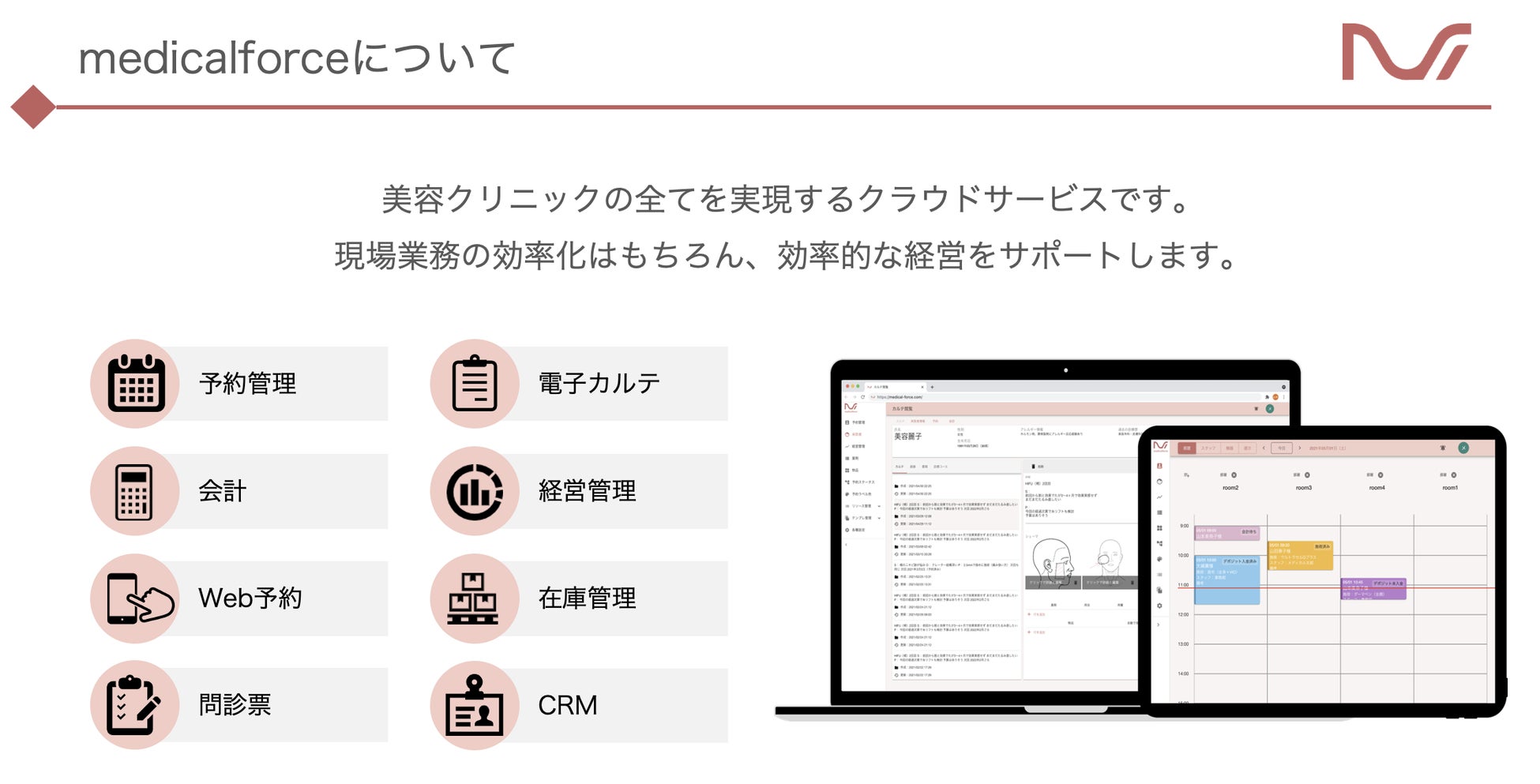 当社が開発・運営を行なっている自費診療向け電子カルテ『medicalforce』(https://service.medical-force.com/)では、美容クリニックの業務を一元管理することでDX化支援を行なってまいりました。2022年6月時点で導入院数は約90院に到達しております。