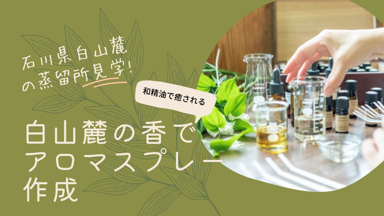 石川県白山麓の豊な森と時間が作り出すアロマでスプレーを作成。蒸留所でアロマオイルが出来ていくの様子を見て頂きながら、精油についてのお話し、地域活性の話も聞く事ができ香りのもたらす癒し効果を、五感を使って体験していただけます。