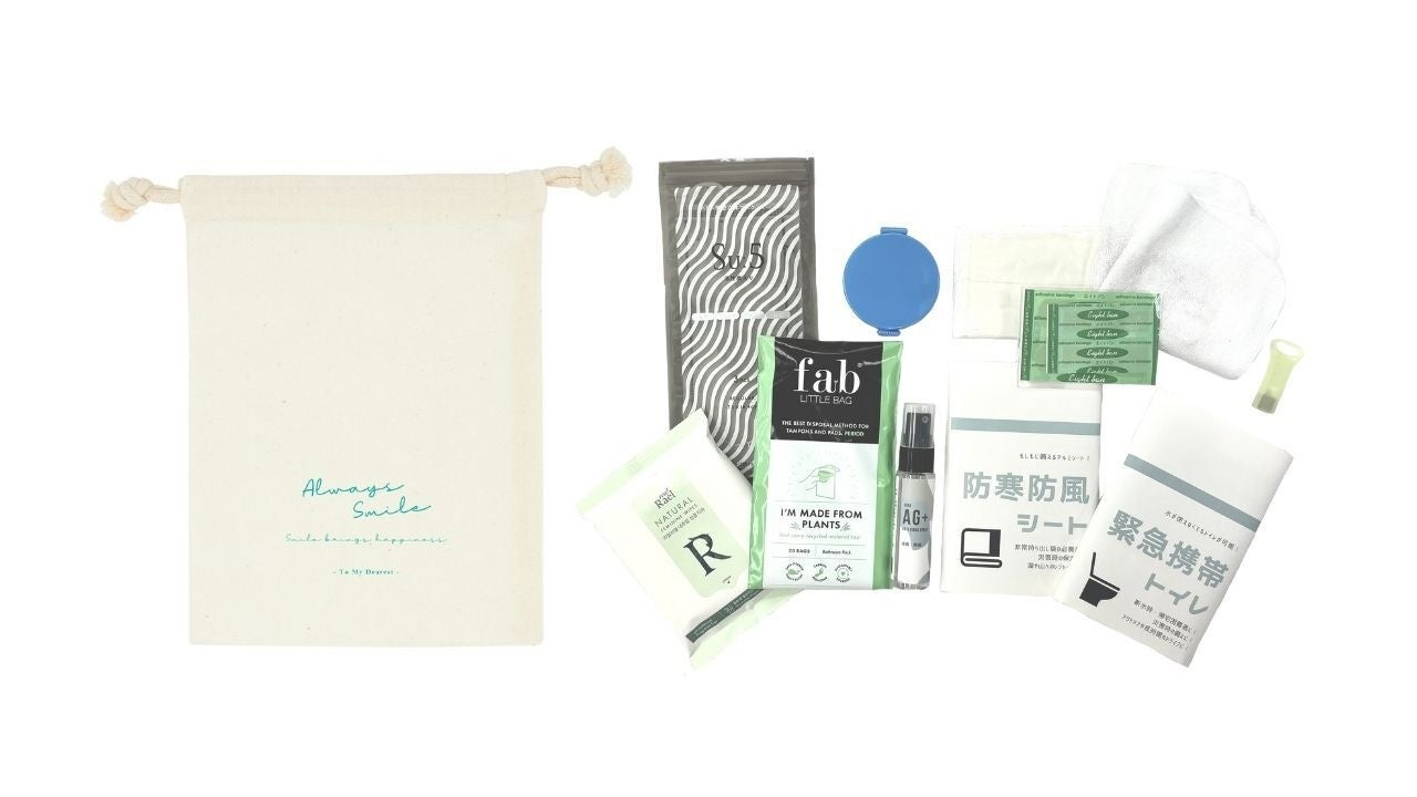 内容:ハンカチ、ティッシュ、ソーイングセット、マスク、絆創膏、携帯トイレ 、アルミシート、