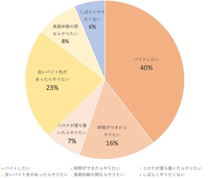 また、Q1回答方に対して、「Q2.今後アルバイトをやりたいですか?」(n=96)と質問したところ、「バイトしたい」が40%、そのほか条件がありつつも今後バイトをしたいと回答した方が54%であった。