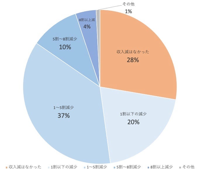 「Q12.具体的にどのくらい収入は減りましたか?」(n=467)という質問に対しては、「収入減はなかった」が28%、「1割以下の減少」が20%、「1〜5割減少」が37%、「5〜8割減少」が10%となった。