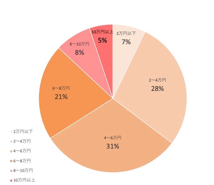 同様に「Q6.アルバイトの月収はどれくらいですか?」(n=391)と質問したところ、一番多く集まった回答は「4〜6万円」(31%)であった。次いで「2〜4万円」が28%、「6〜8万円」が21%である。