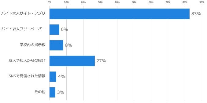「Q3.アルバイトはどのように探しますか?」(n=487)と複数回答有りで質問したところ、「バイト求人サイト・アプリ」が83%、「友人や知人からの紹介」が27%、「学校内の掲示板」が8%、「バイト求人フリーペーパー」が6%、「SNSで発信された情報」が4%となった。
