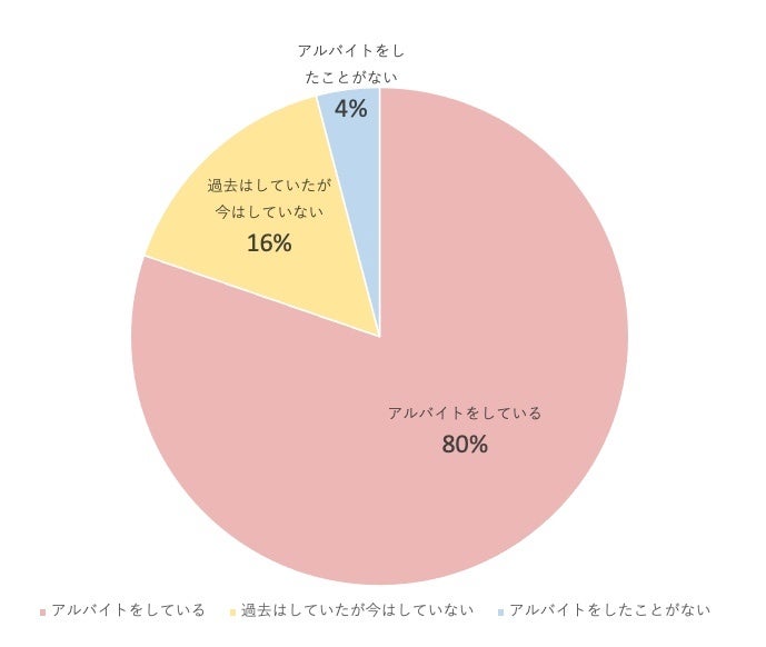 「Q1.現在アルバイトをしていますか?」(n=487)と質問したところ、「アルバイトをしている」が80%、「過去はしていたが今はしていない」が16%、「アルバイトをしたことがない」が4%となった。