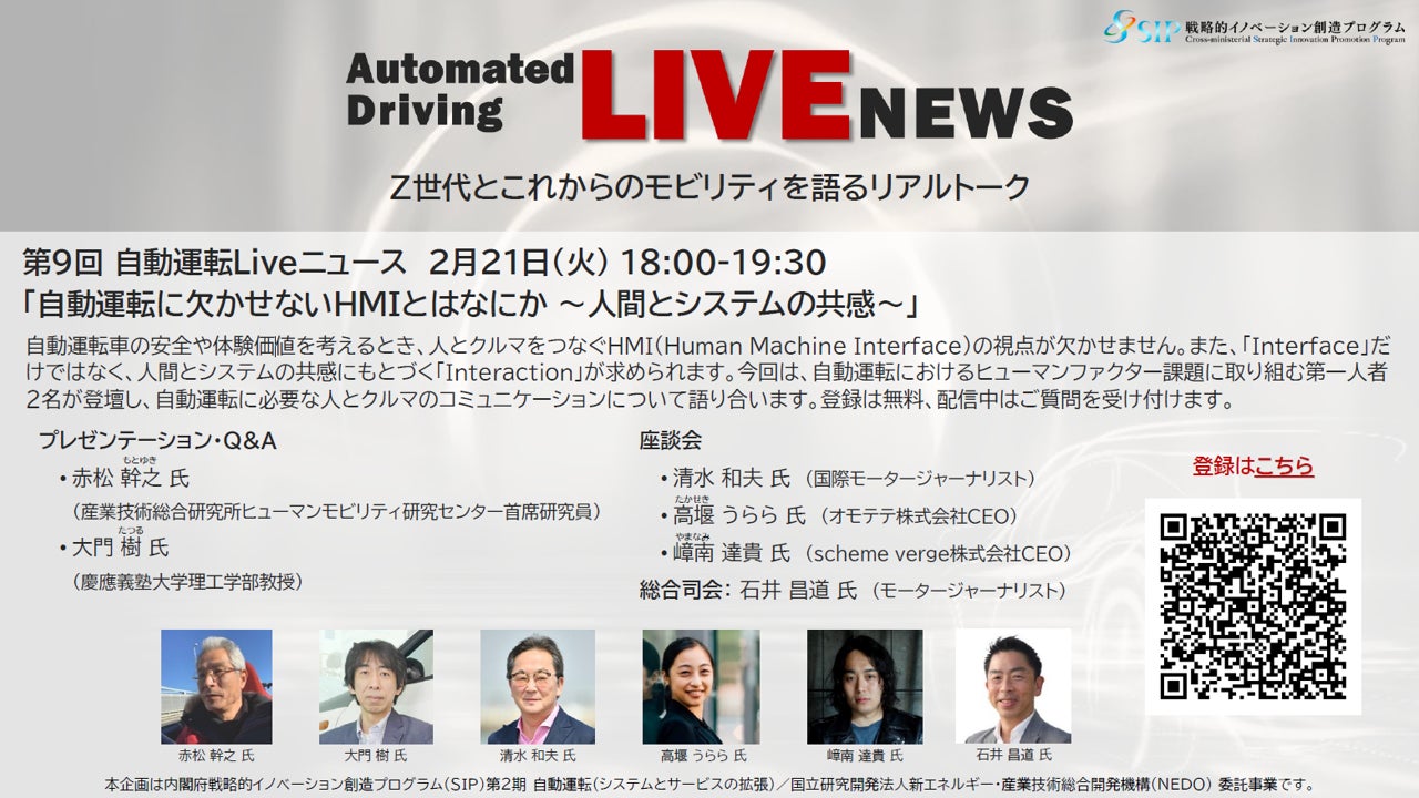 自動運転に関するトピックを若い世代と語る「自動運転Liveニュース」。第9回のテーマは「自動運転に欠かせないHMIとはなにか 〜人間とシステムの共感~」。2023年2月21日(火)にオンラインで開催します(参加無料)。