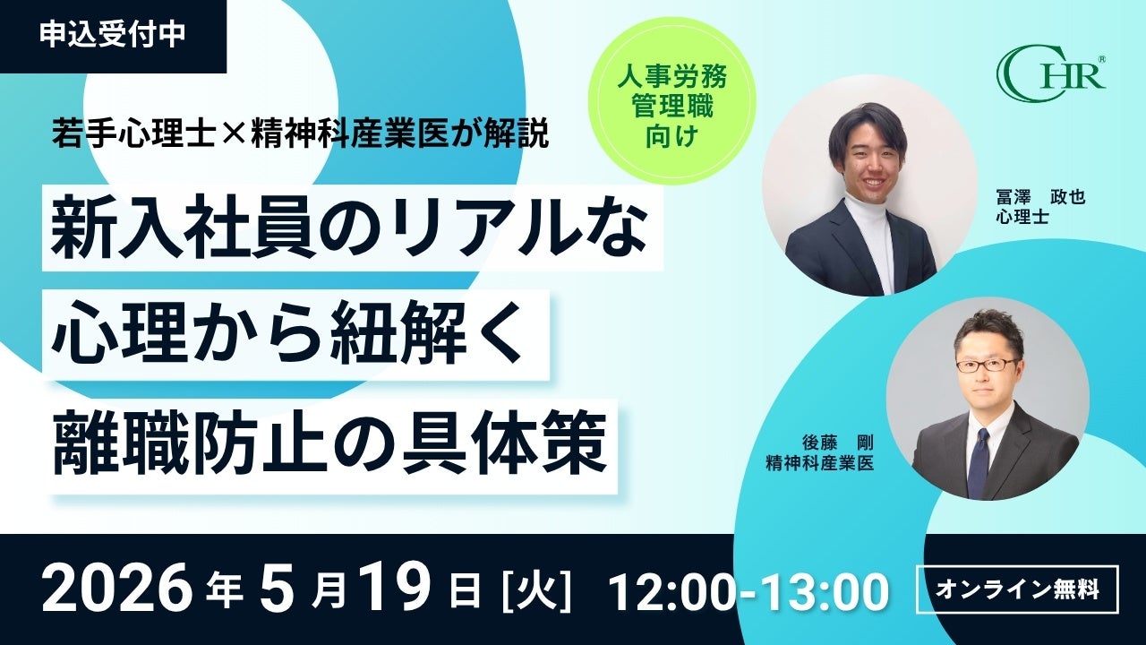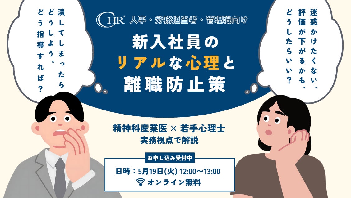 日本CHRコンサルティング株式会社(所在地:東京都港区、代表取締役:渡辺洋一郎、以下CHR)は、無料オンラインセミナー「新入社員のリアルから読み解く|離職防止とメンタルヘルス対策」を開催いたします。
