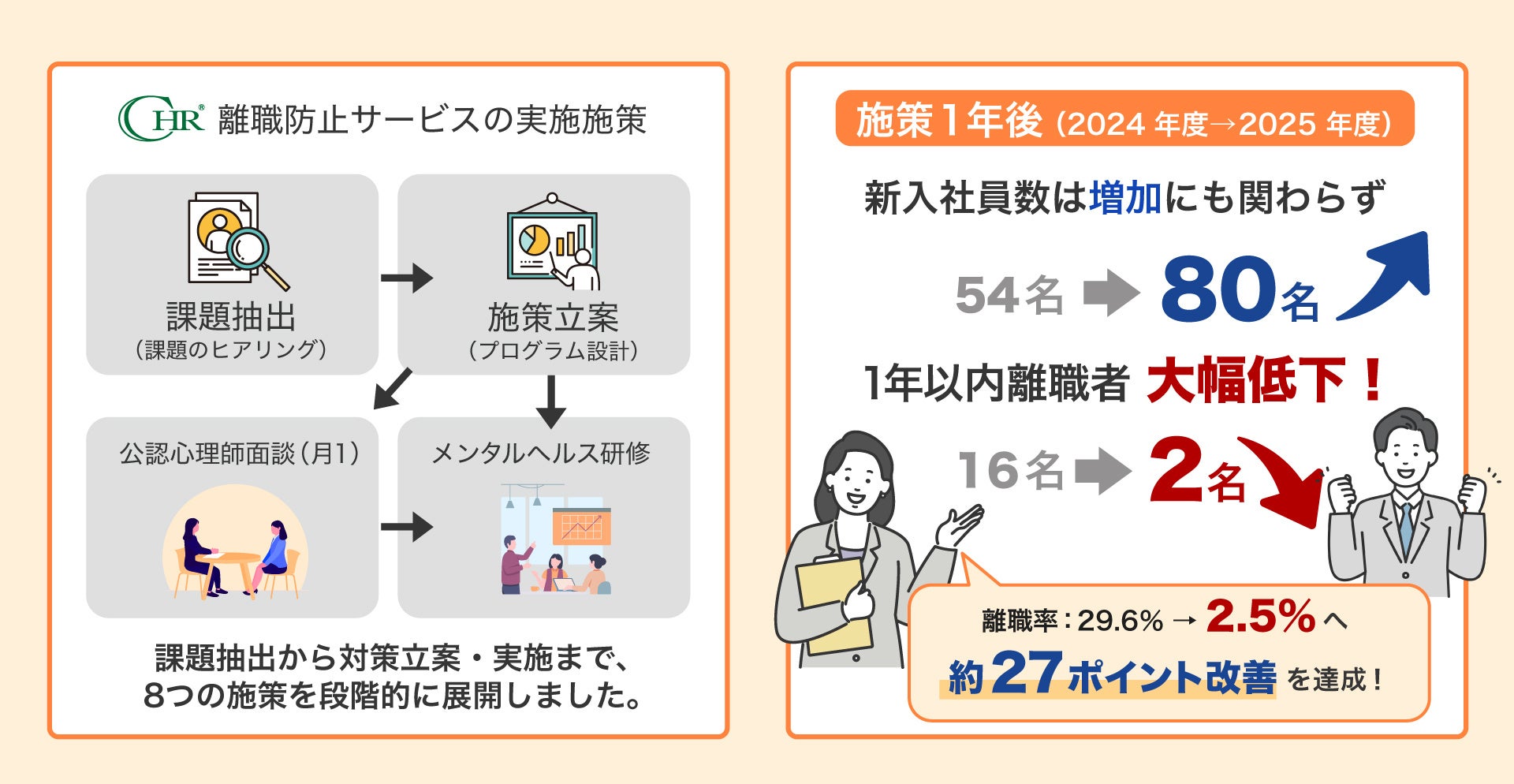介入から約1年。同社の新入社員数は54名から 80名へと増加 した一方、1年以内の離職者は 16名→2名 へと激減。離職率は29.6%から2.5%へ、約27ポイント改善 を達成しました。
