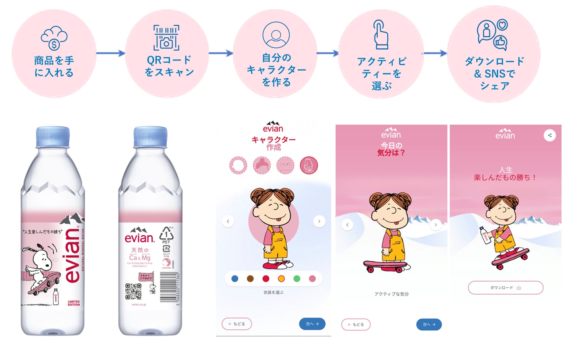 コンビニエンスストア、ドラッグストア、量販店、及びオンラインストアなどでエビアン製品を購入し、記載のQRコードをスマートフォンのカメラで読み取ると、特設サイト上でオリジナルアバターが作成できます。好きな髪型、表情、衣装、「今日の気分」を選択すると、心身をリフレッシュするさまざまなアクティビティにちなんだスヌーピーの名言・文章が添えられたオリジナルアバターが生成されます。オリジナルアバターは、背景付き、もしくはキャラクターのみのいずれかの形式でダウンロードできます。作成後はぜひ「#evianxsnoopy」のハッシュタグをつけて、SNSで自分だけのオリジナルアバターを共有してみませんか。