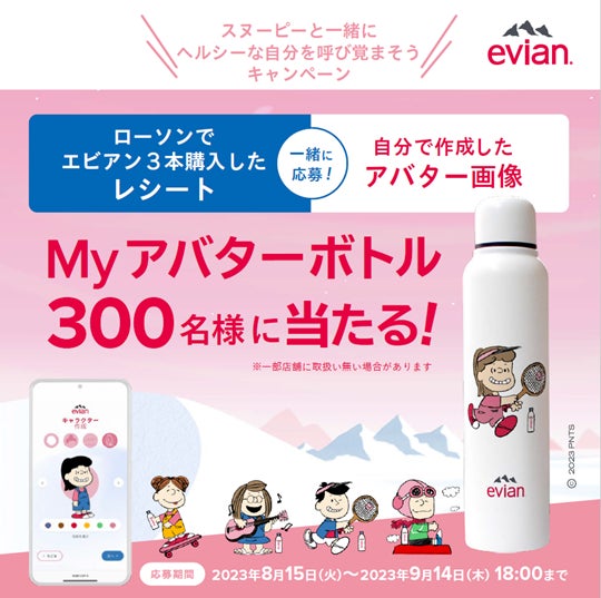 8月15日(火)から9月14日(木)までの間に、ローソンで対象のエビアン®製品を3本ご購入の上、オリジナルアバターを作成し、キャンペーンサイトで購入レシートをアップロードすると、「スヌーピーと一緒にヘルシーな自分を呼び覚まそう」キャンペーンに応募いただけます。抽選で合計300名様に自分のアバターが印刷された「My アバターボトルセット」が当たります。