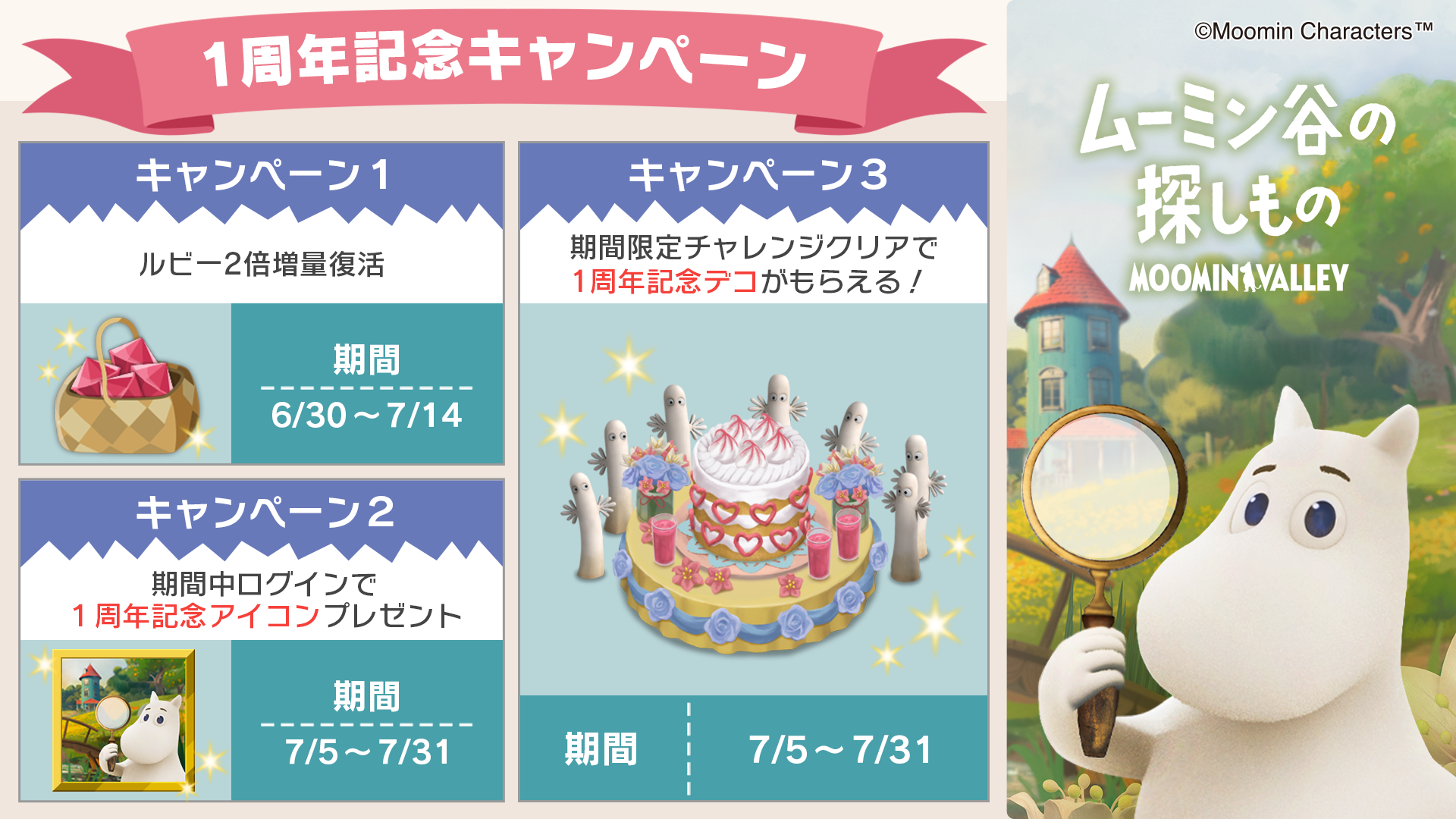 株式会社Tokyo hammockはAndroid/iOS向けアイテム探しゲーム『ムーミン谷の探しもの』が2022年7月5日(火)にリリースから1周年を迎えるにあたり、2022年7月31日(日)までリリース1周年を記念したキャンペーンを開催することをお知らせ致します。