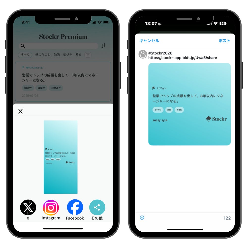 株式会社ビルディット(所在地:東京都八王子市、代表取締役:富田陽介)は、提供する振り返りノートアプリ「Stockr(ストッカー)」において、新年の抱負や目標、理想の自分を外部へ共有できる新機能「ビジョンシェア機能」を2025年12月19日にリリースしました。本機能では、設定したビジョンを家族や友人、SNSなどに共有することで、目標や理想の自分の実現に向かう行動を続けやすくします。