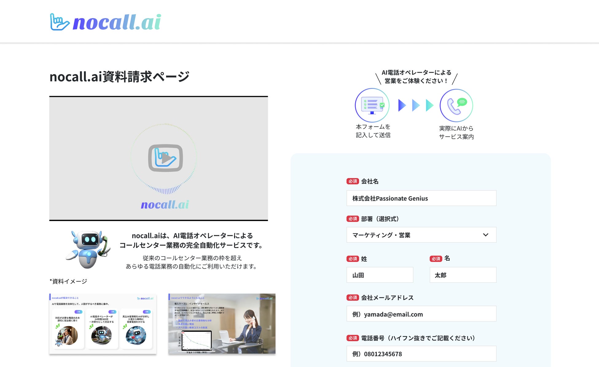 以下のURLから資料請求をしていただくことで、実際にAI電話オペレーターによる営業(インサイドセールス)をご体験いただくことが可能になっております。