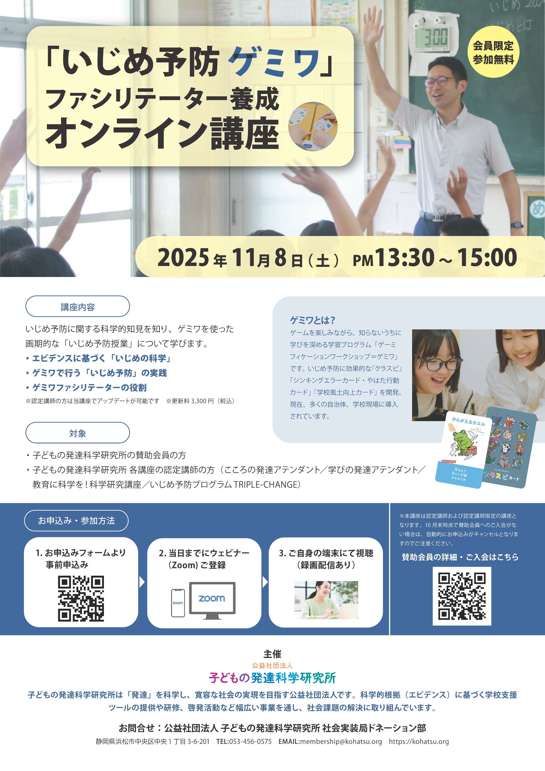 本講座では、いじめ予防に関する最新の科学的知見と、当研究所が開発した教育支援プログラム「ゲミワ」を活用した「いじめ予防授業」の実践方法が学べます。