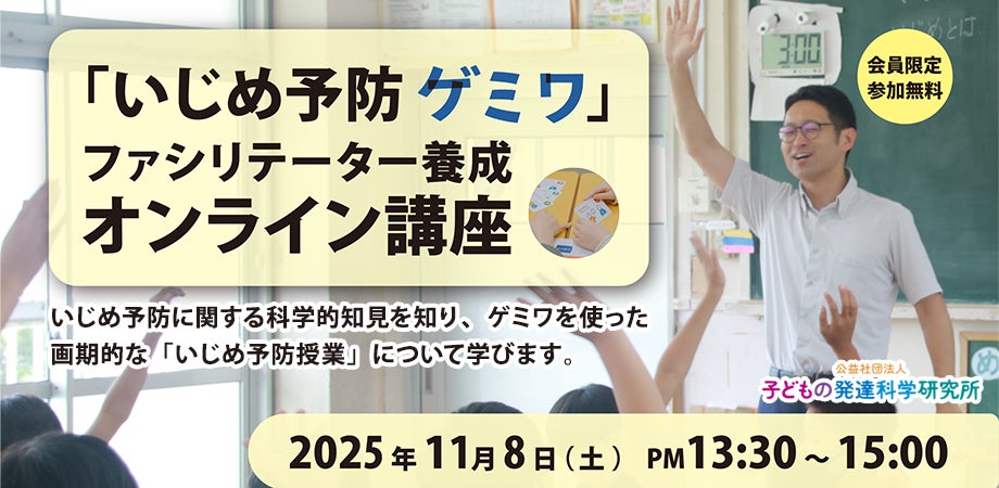 公益社団法人 子どもの発達科学研究所(本部:大阪市北区)は、2025年11月8日(土)に「いじめ予防ゲミワ」ファシリテーター養成 オンライン講座を開催いたします。