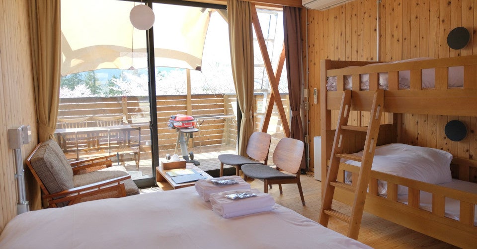 ダブルベッドのほか、幼いころのワクワクを思い出させる二段ベッド、1階と2階にデッキを備えた、シンプルな客室です。朝が来たら、カーテンを開け放して、窓枠に切り取られた日本の原風景「里山」をぜひ楽しんで。