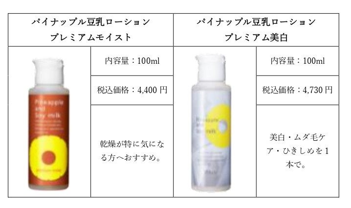 表に記載のある2商品以外のパイナップル豆乳ローション、パイナップル豆乳ローションプレミアム、パイナップル豆乳ローションスキンミルクにも今後配合予定です。