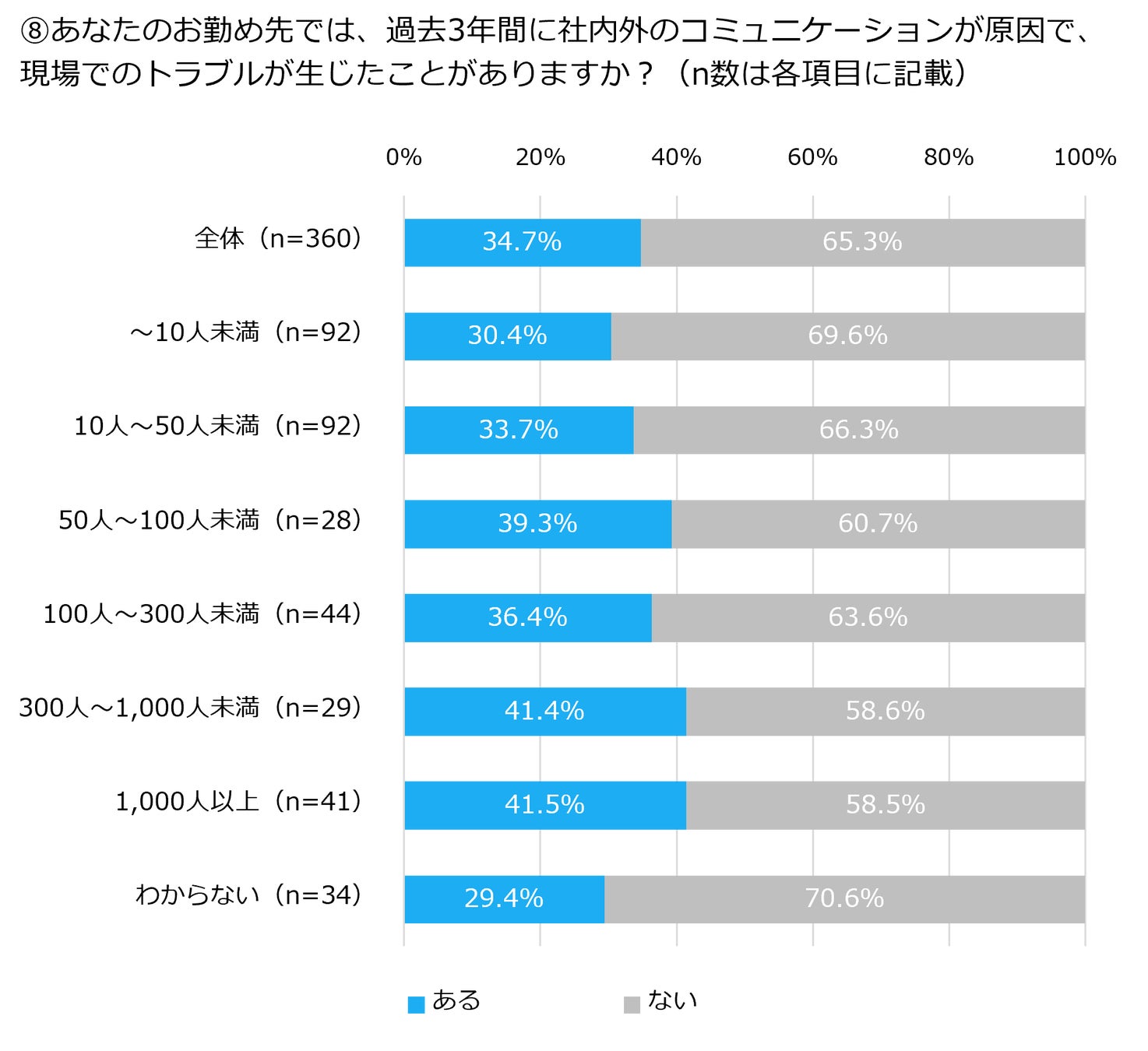回答者全員に、過去3年間に社内外のコミュニケーションが原因で、現場でトラブルが生じたかどうかを聞きました。