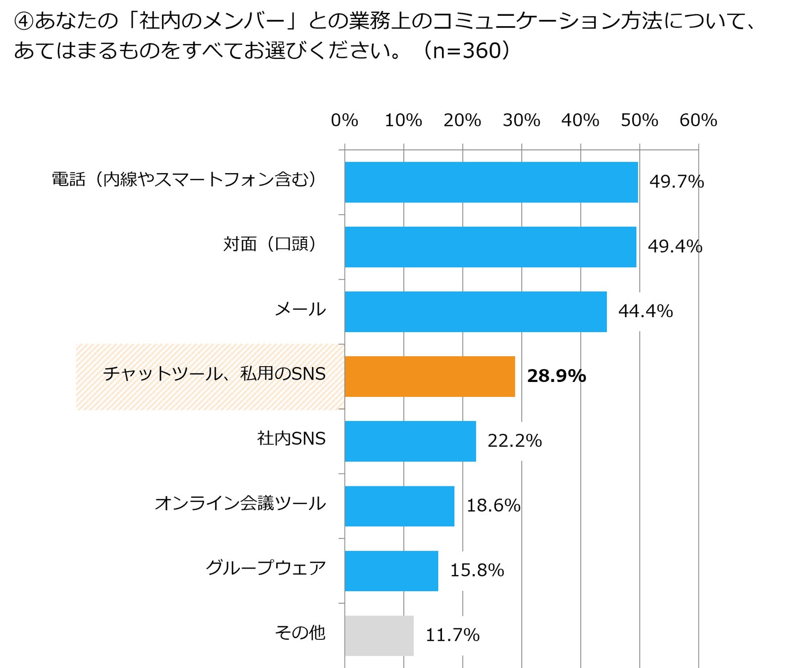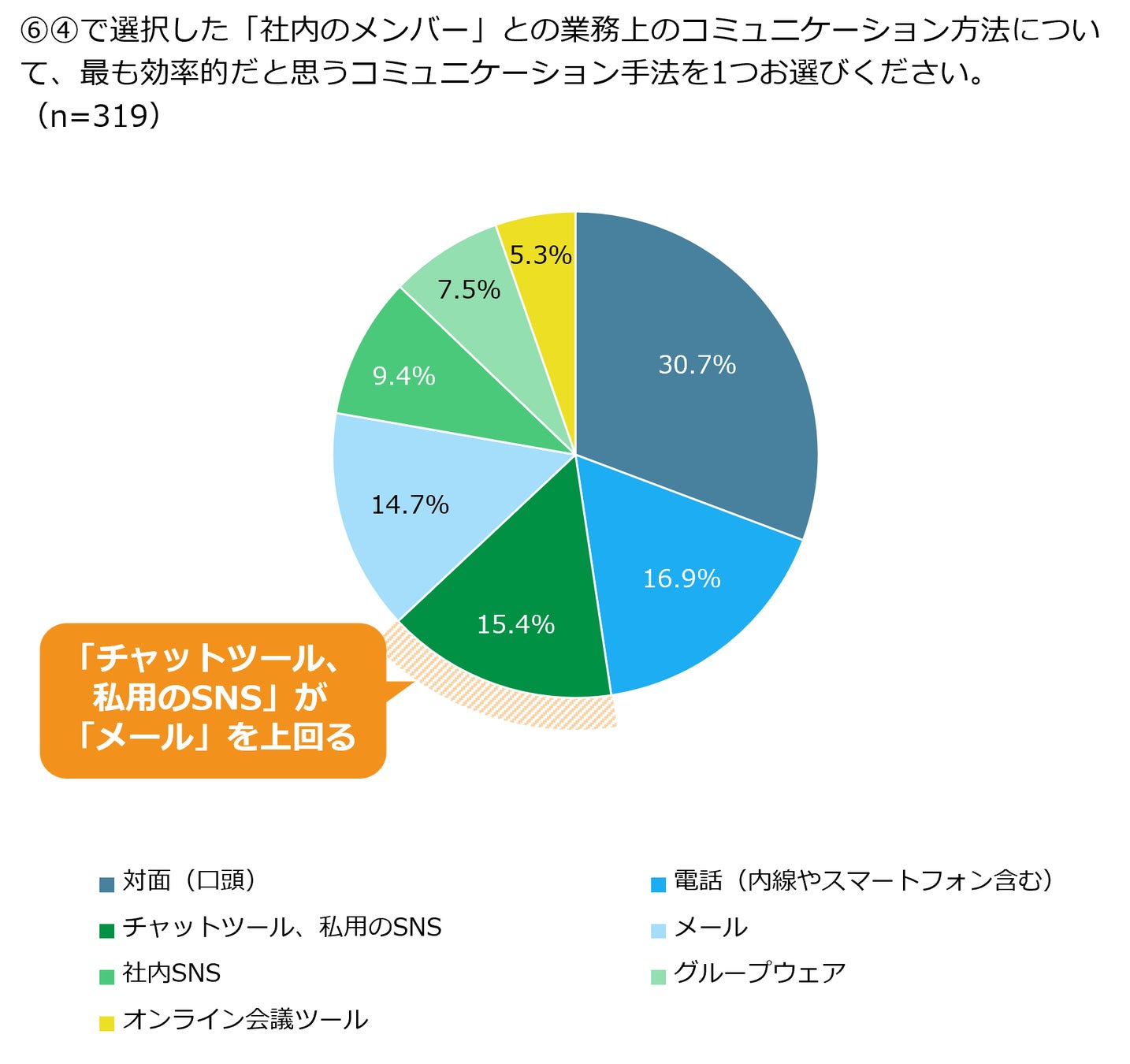 最多回答は「対面」(30.7%)で、「電話」(16.9%)、「チャットツール、私用のSNS」(15.4%)、「メール」(14.7%)の順となりました。