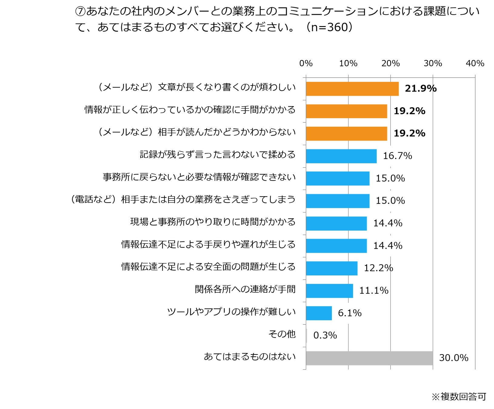 回答のトップ3は、「文章が長くなり書くのが煩わしい」(21.9%)、「情報が正しく伝わっているかの確認に手間がかかる」(19.2%)、「相手が読んだかどうかわからない」(19.2%)でした。