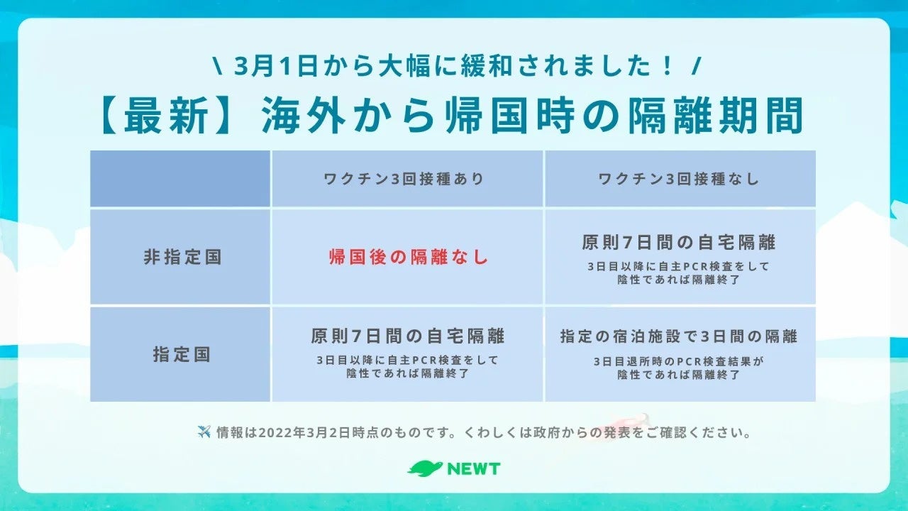 そのような中で、今回令和トラベルとして海外渡航の回復予測を行う背景として、今月からはじまった「水際対策の緩和」があります。2022年3月1日に水際対策の緩和が行われ、もともと海外から日本入国後、原則7日間の自宅もしくはホテル隔離を強いられていましたが、ワクチン3回接種及びオミクロン非指定国(ハワイ、グアム、タイ、オーストラリアなど)であれば日本帰国後の隔離がなしとなりました。