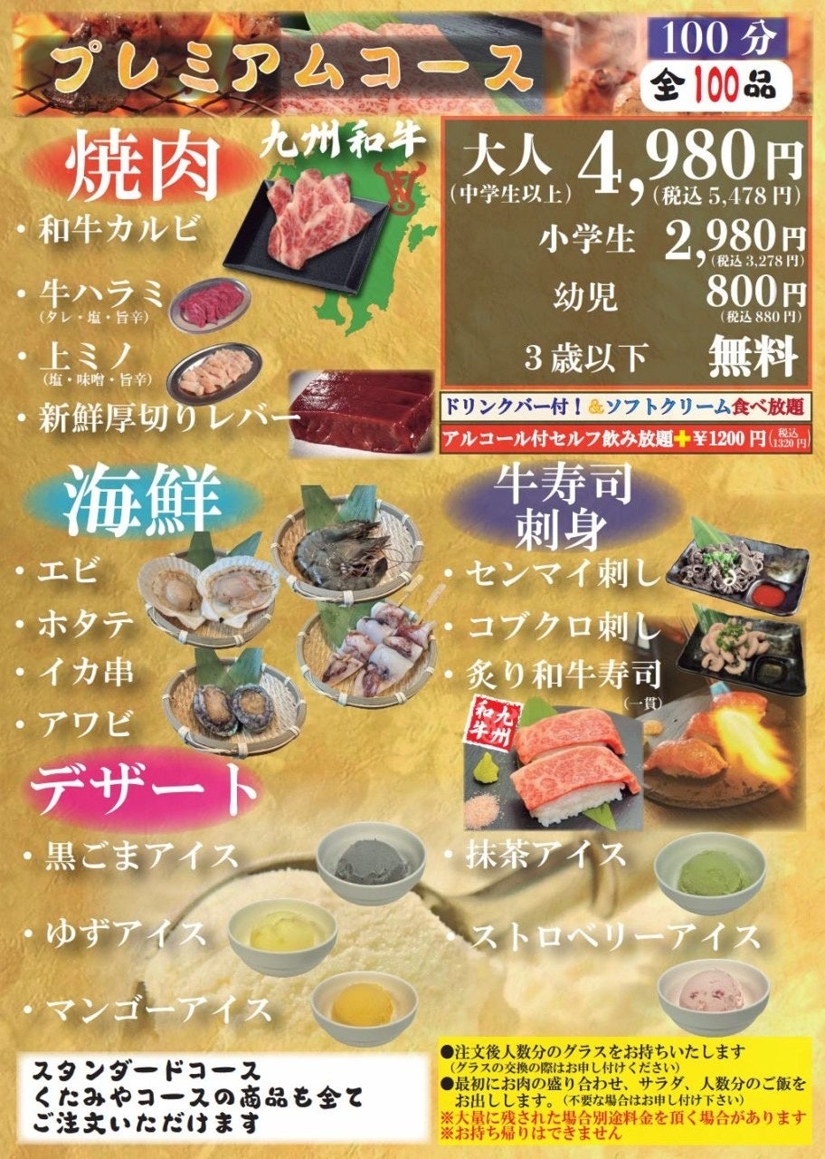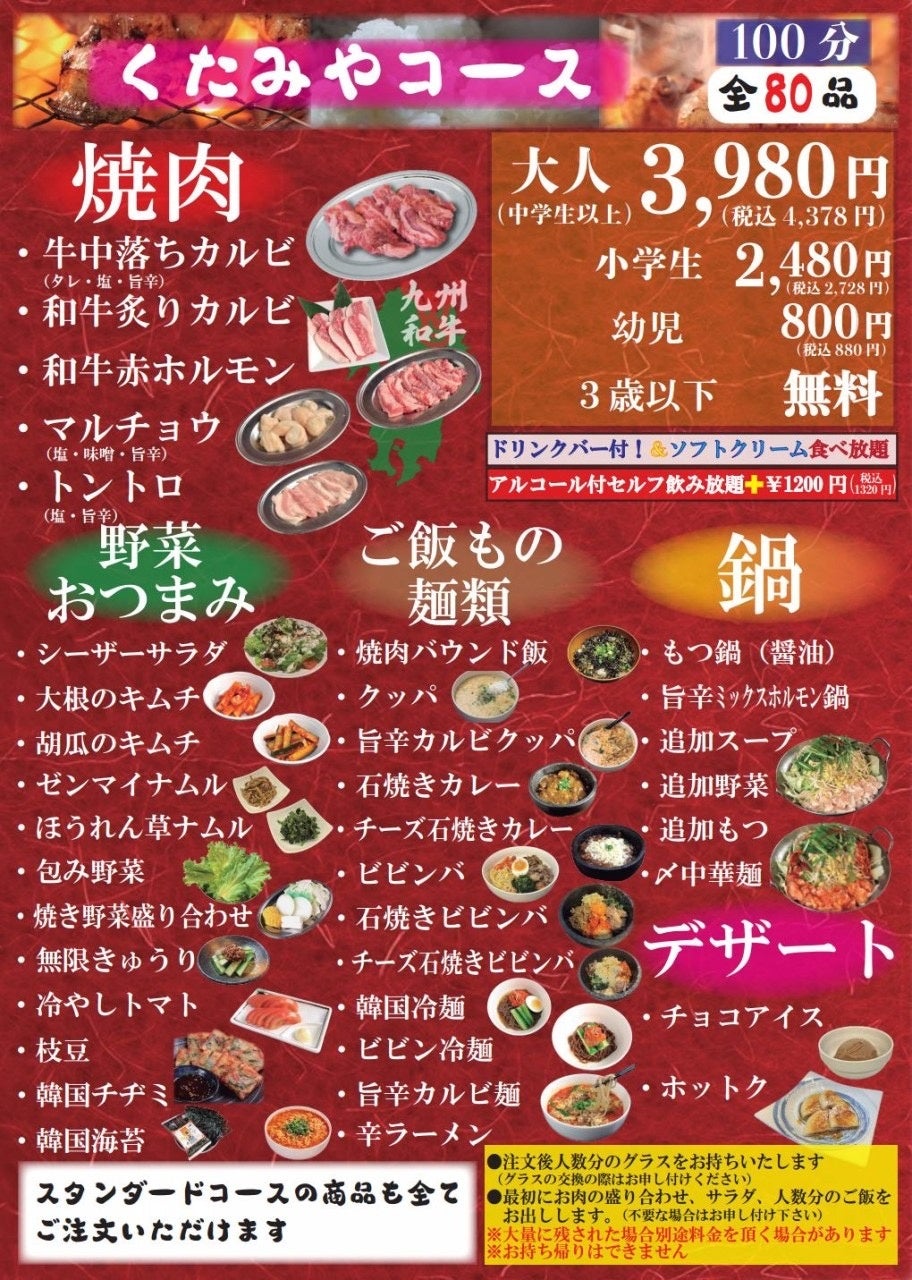 食べ放題プラン(90分)の他に宴コース(120分飲み放題付き)も4,000円〜ございます。