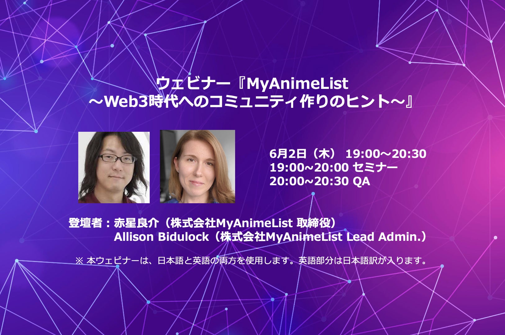 月間1,800万人のユーザーたちが本サービスを安全に楽しむ中、サイト内の自治はどう成立しているのか、MyAnimeListが考えるコミュニティの定義、ゼロからのコミュニティの作り方、貢献度の高いユーザーのモチベーションとは何かなど、Web3時代をひもとく重要な要素を、15年間ユーザー主体の運営を手がけてきた人気サービスのMyAnimeListの事例から、取締役の赤星良介とコミュニティのLead Admin.を努めるAllison Bidulockがお話しします。