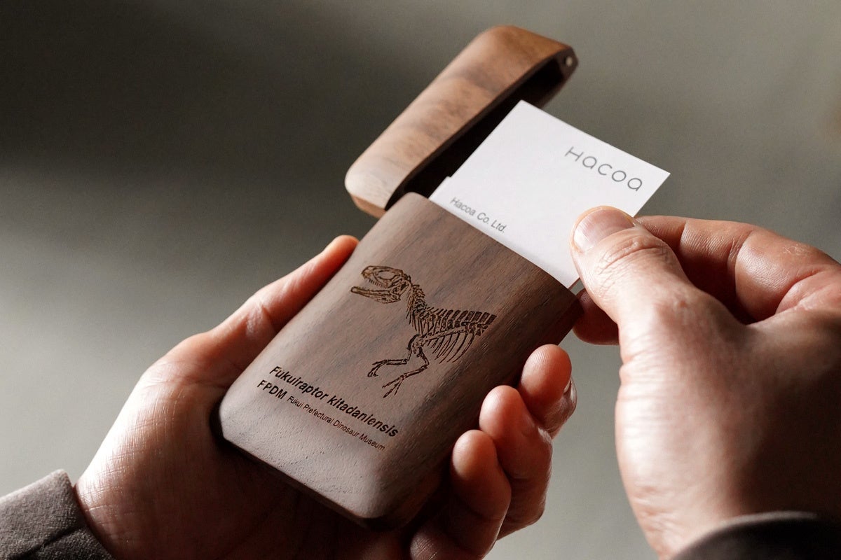 【新商品】福井県立恐竜博物館 × Hacoa コラボ第2弾!「フクイラプトル」の骨格を刻印した、大人のための木製ビジネスアイテム4種を3月19日より発売