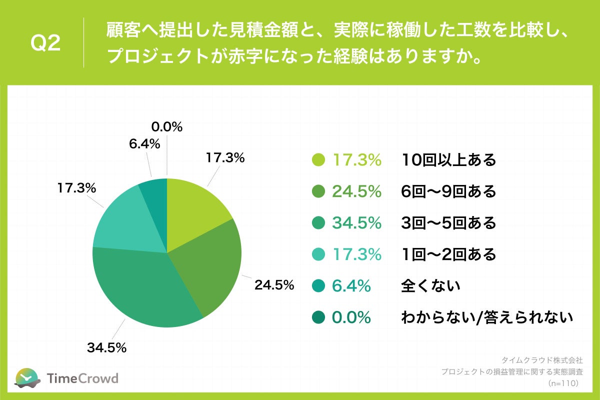 「Q2.顧客へ提出した見積金額と、実際に稼働した工数を比較し、プロジェクトが赤字になった経験はありますか。」(n=110)と質問したところ、「10回以上ある」が17.3%、「6回~9回ある」が24.5%という回答となりました。