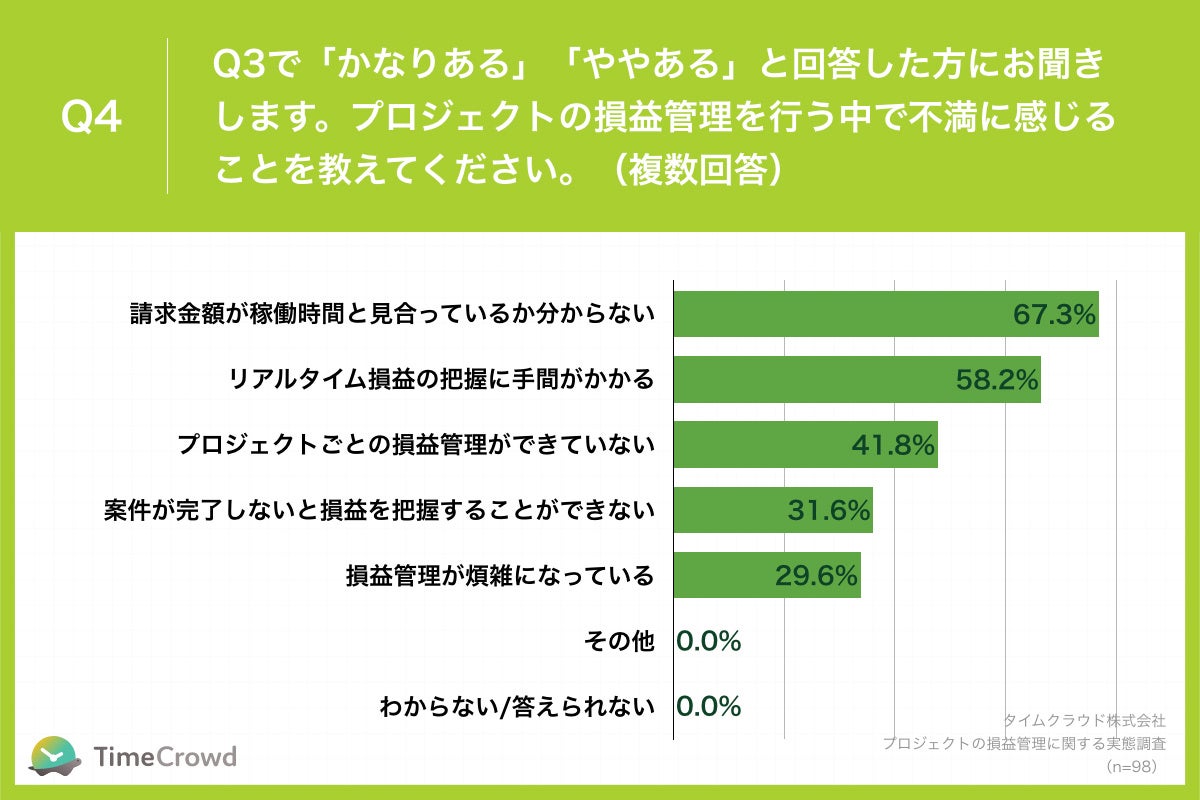 Q3で「かなりある」「ややある」と回答した方に、「Q4.プロジェクトの損益管理を行う中で不満に感じることを教えてください。(複数回答)」(n=98)と質問したところ、「請求金額が稼働時間と見合っているか分からない」が67.3%、「リアルタイム損益の把握に手間がかかる」が58.2%、「プロジェクトごとの損益管理ができていない」が41.8%という回答となりました。