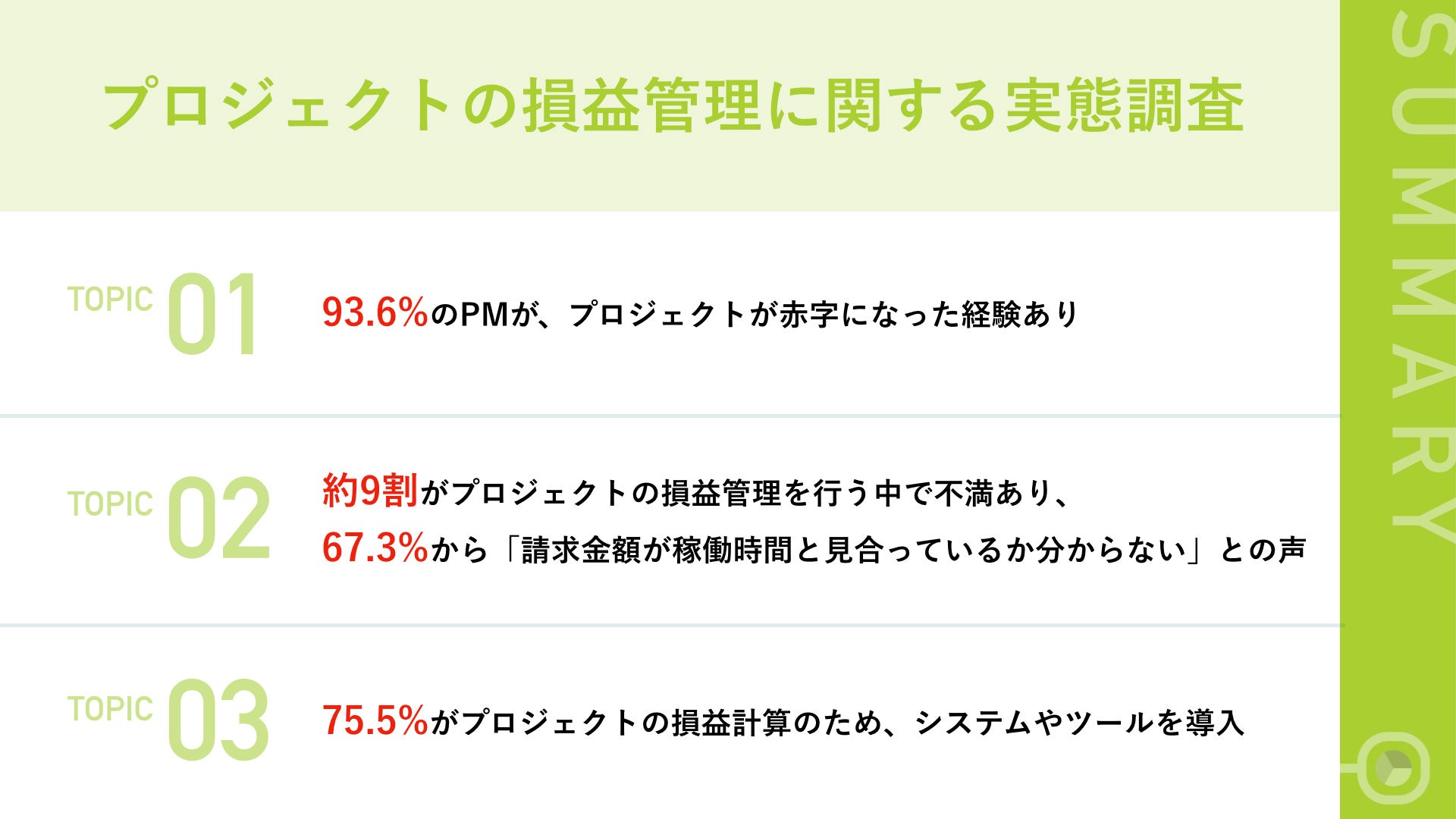 93.6%のPM(プロジェクトマネージャー)が、プロジェクトが赤字になった経験を持っており、プロジェクトの損益管理を行う中でも不満を抱えていることが分かりました。不満の内容を伺うと、67.3%から「請求金額が稼働時間と見合っているか分からない」との声が挙がり、他にも「損益計算書を細分化したデータが見れない」や「関係者が多く、リアルタイムに管理できない」という不満の声も。