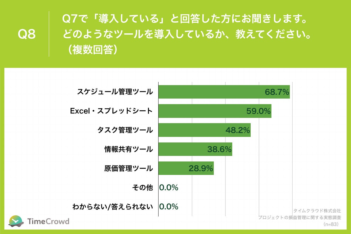 Q7で「導入している」と回答した方に、「Q8.どのようなツールを導入しているか、教えてください。(複数回答)」(n=83)と質問したところ、「スケジュール管理ツール」が68.7%、「Excel・スプレッドシート」が59.0%、「タスク管理ツール」が48.2%という回答となりました。