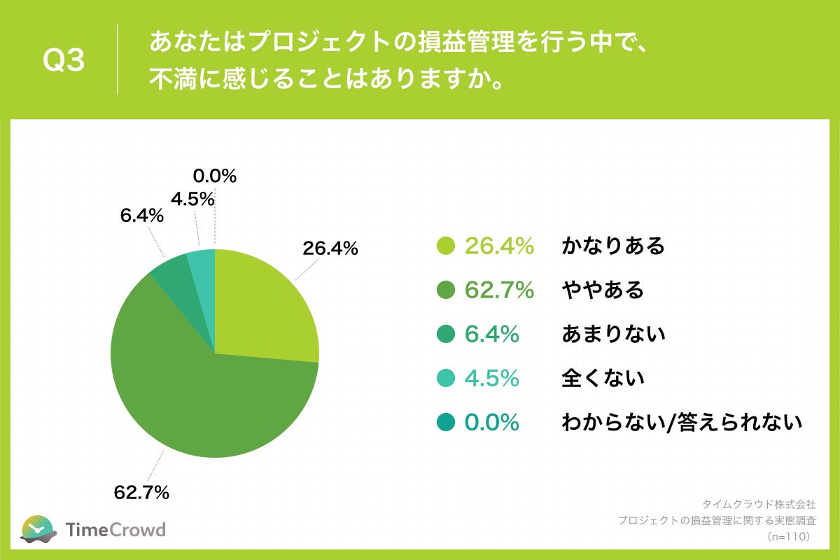 「Q3.あなたはプロジェクトの損益管理を行う中で、不満に感じることはありますか。」(n=110)と質問したところ、「かなりある」が26.4%、「ややある」が62.7%という回答となりました。