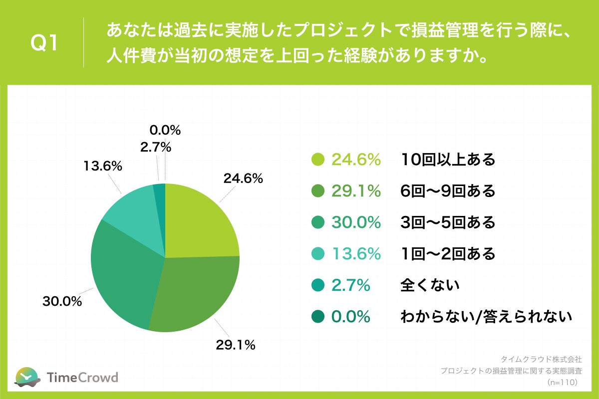 「Q1.あなたは過去に実施したプロジェクトで損益管理を行う際に、人件費が当初の想定を上回った経験がありますか。」(n=110)と質問したところ、「10回以上ある」が24.6%、「6回~9回ある」が29.1%という回答となりました。
