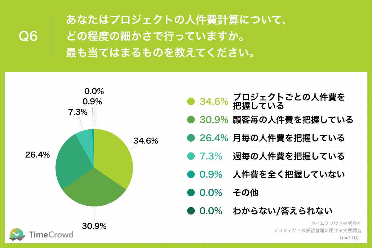 「Q6.あなたはプロジェクトの人件費計算について、どの程度の細かさで行っていますか。最も当てはまるものを教えてください。」(n=110)と質問したところ、「プロジェクトごとの人件費を把握している」が34.6%、「顧客毎の人件費を把握している」が30.9%という回答となりました。