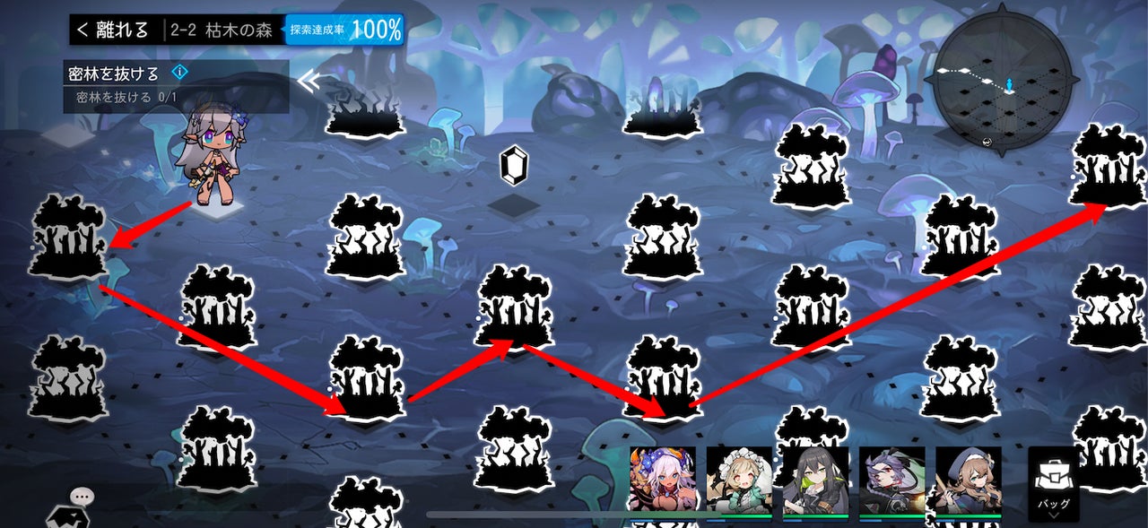 正解はこちらのルートです。木を一つ一つよく見るとエレメントではない太い樹木が紛れているため、そちらを選んで通ることで、幻術の邪魔を受けずに迷宮の奥へ進むことができます。