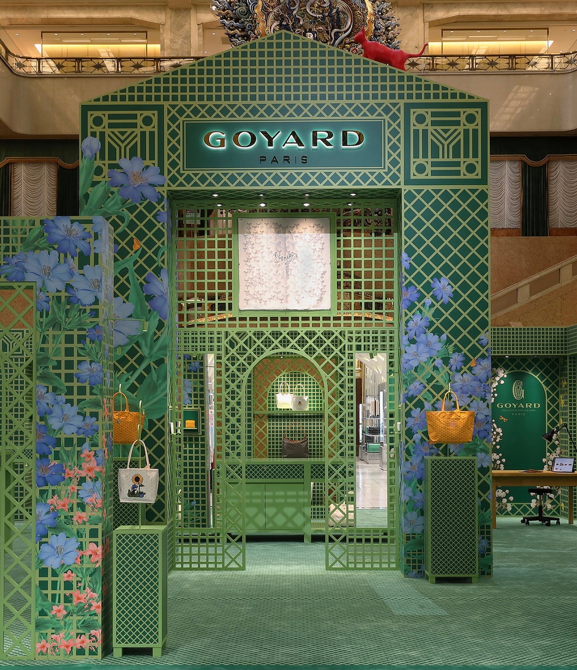 メゾンの2025年テーマ「Le Jardin Goyard(ル・ジャルダン・ゴヤール)」に沿って、緑豊かな空間は、鮮やかな花々で溢れるフェンスやアーチを備え、魅惑的なアル・フレスコ・フレンチガーデンを想起させるようにデザインされています。
