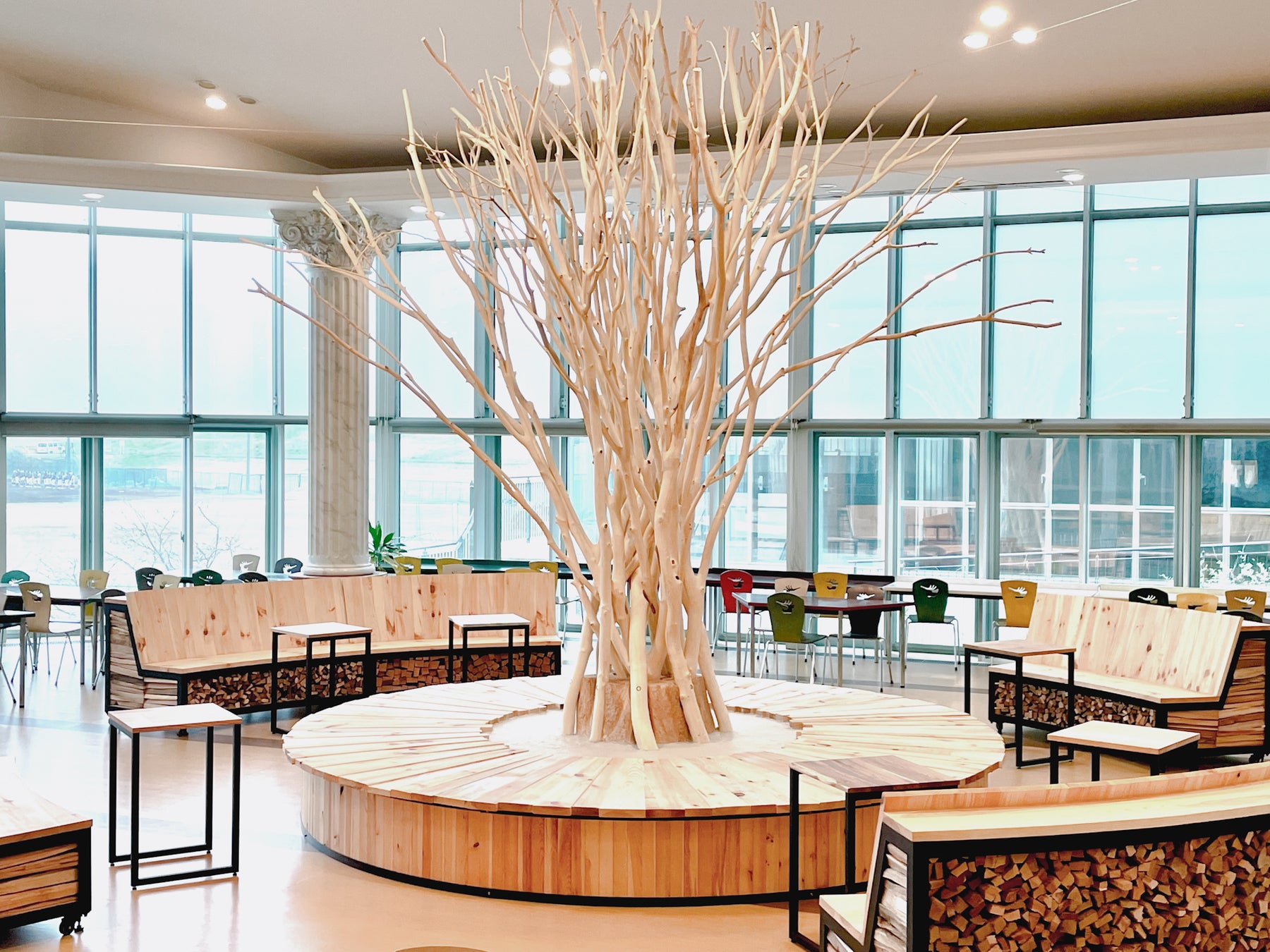 天然木のシンボルツリーと、色とりどりの薪のベンチ、個性的な木目の表情を持つテーブル。