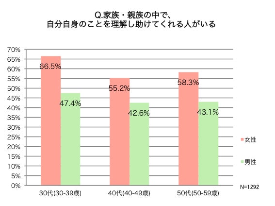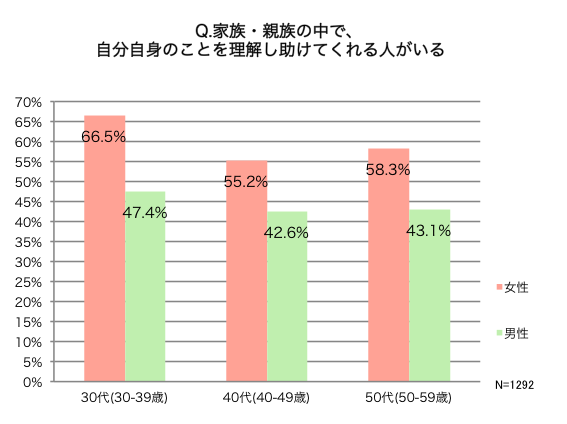 もう一つの調査結果を見ると、「家族・親族の中で、自分自身のことを理解し助けてくれる人がいる」と答えた30代女性は、同じ世代の男性に比べて、19.1%も高い66.5%もいることがわかりました。10代を前に“男女雇用機会均等法”が施行され、物心ついた頃からジェンダー教育にも比較的馴染みの深い世代である30代共働き家庭では、男性も進んでサポートにまわってくれることなどがその高い数値の要因と言えるのかもしれません。