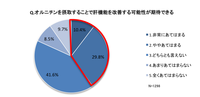 本調査と合わせて行ったオルニチンの認知度調査によると、オルニチンを摂取することで「肝機能を改善する可能性が期待できる」と答えた方は、40.2%にとどまり、半数以上の人が、未だオルニチンの肝機能に対する効能を知りません。