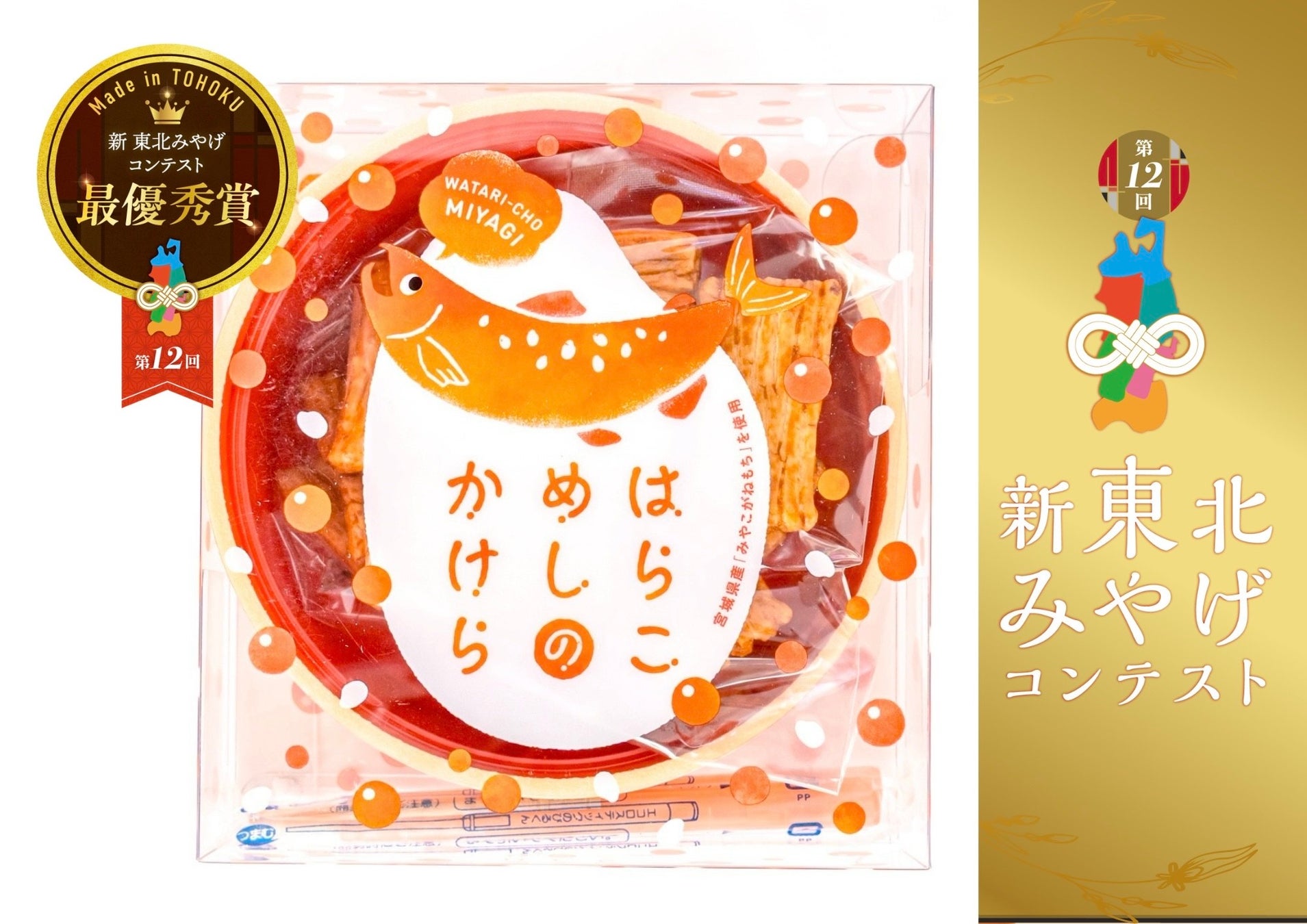 宮城県亘理町の郷土料理「はらこめし」を模したあられで、宮城県産のもち米「みやこがねもち」を使った生地にサケを練り込み、イクラを漬け込んだしょうゆで味付けしています。パッケージは実際の「はらこめし」を食べるようにわっぱと箸を添えており、いただく命への感謝の想いも込めた商品です。