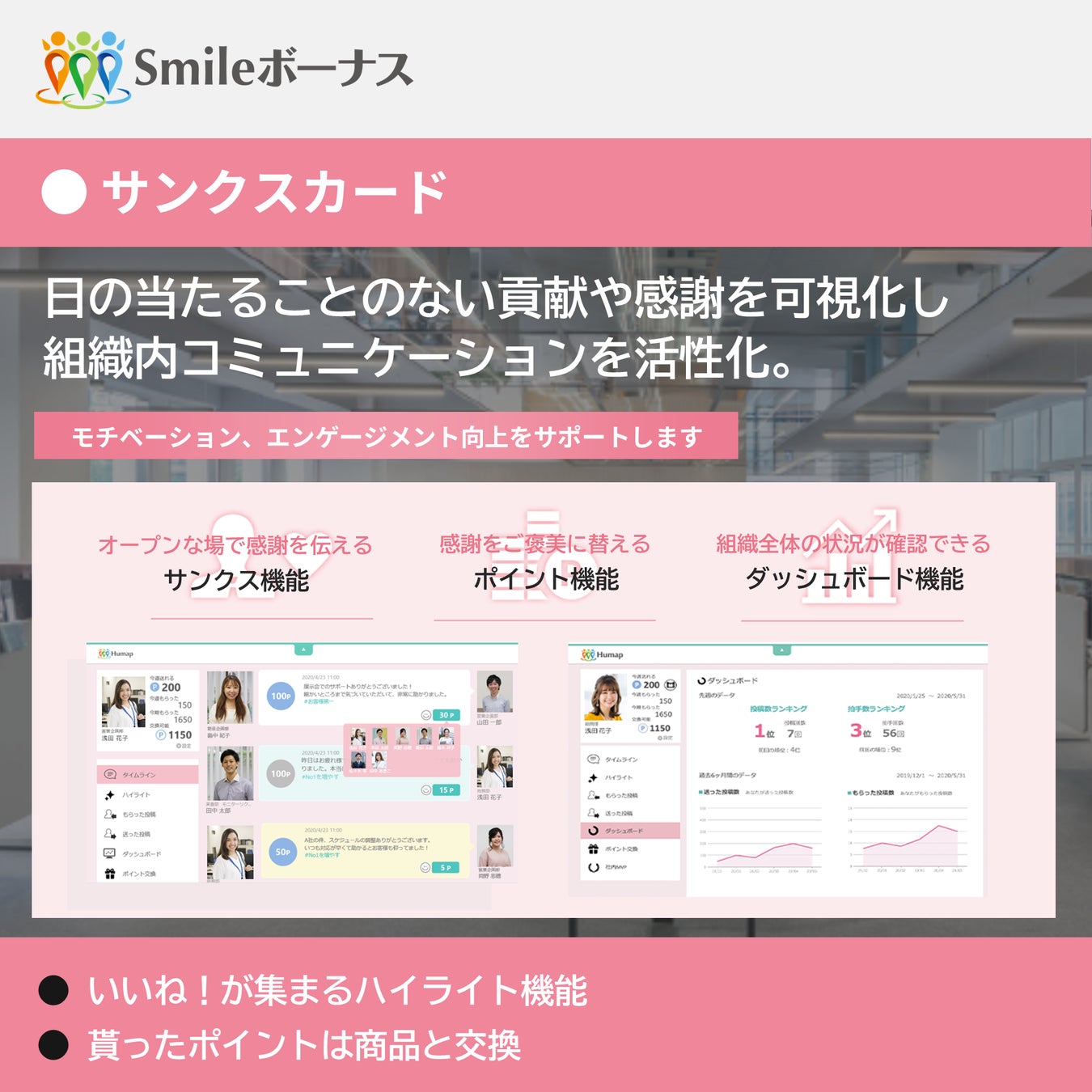 - 社員同士で感謝の気持ちをボーナスとして送りあうサンクスカード「Smileボーナス」 で新しい組織内コミュニケーションのあり方を提案