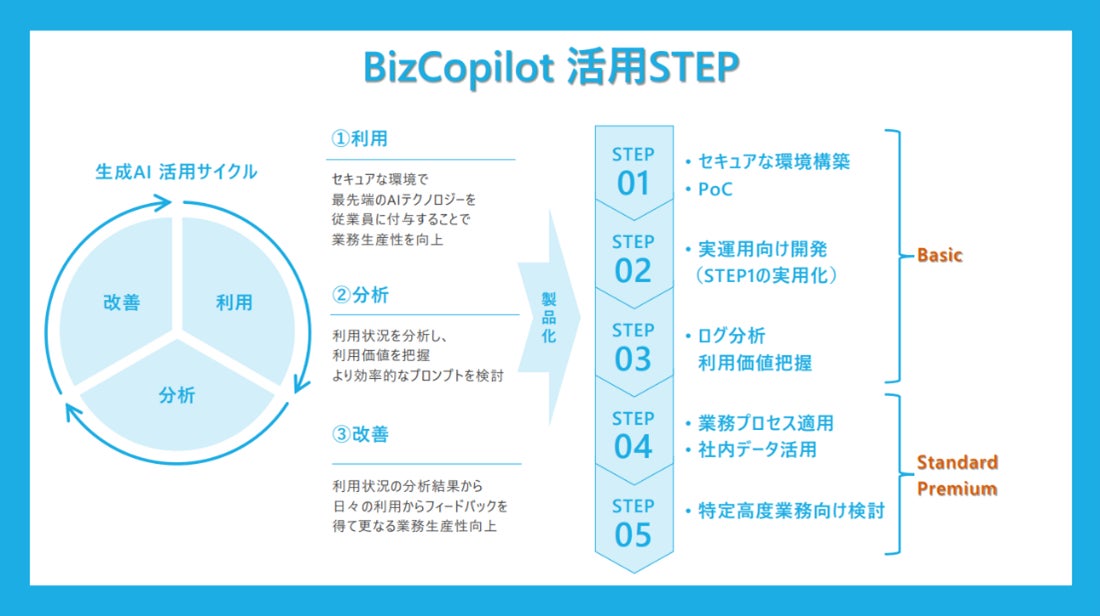BizCopilot Powered By ChatGPTでは、既存機能として、STEP01からSTEP03まで対応しています。ログの分析やSTEP04、STEP05は皆様に合わせた柔軟な拡張が可能です。