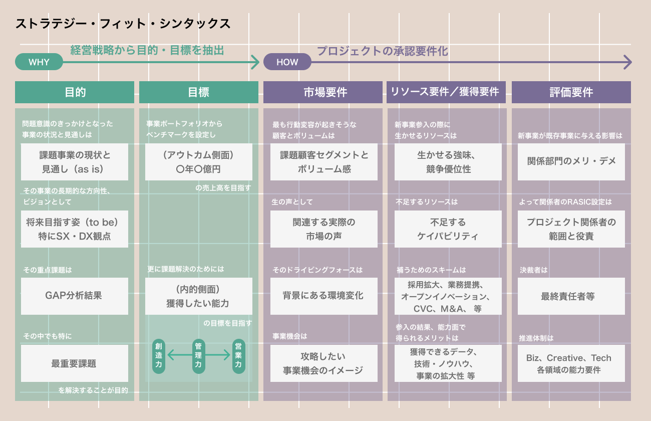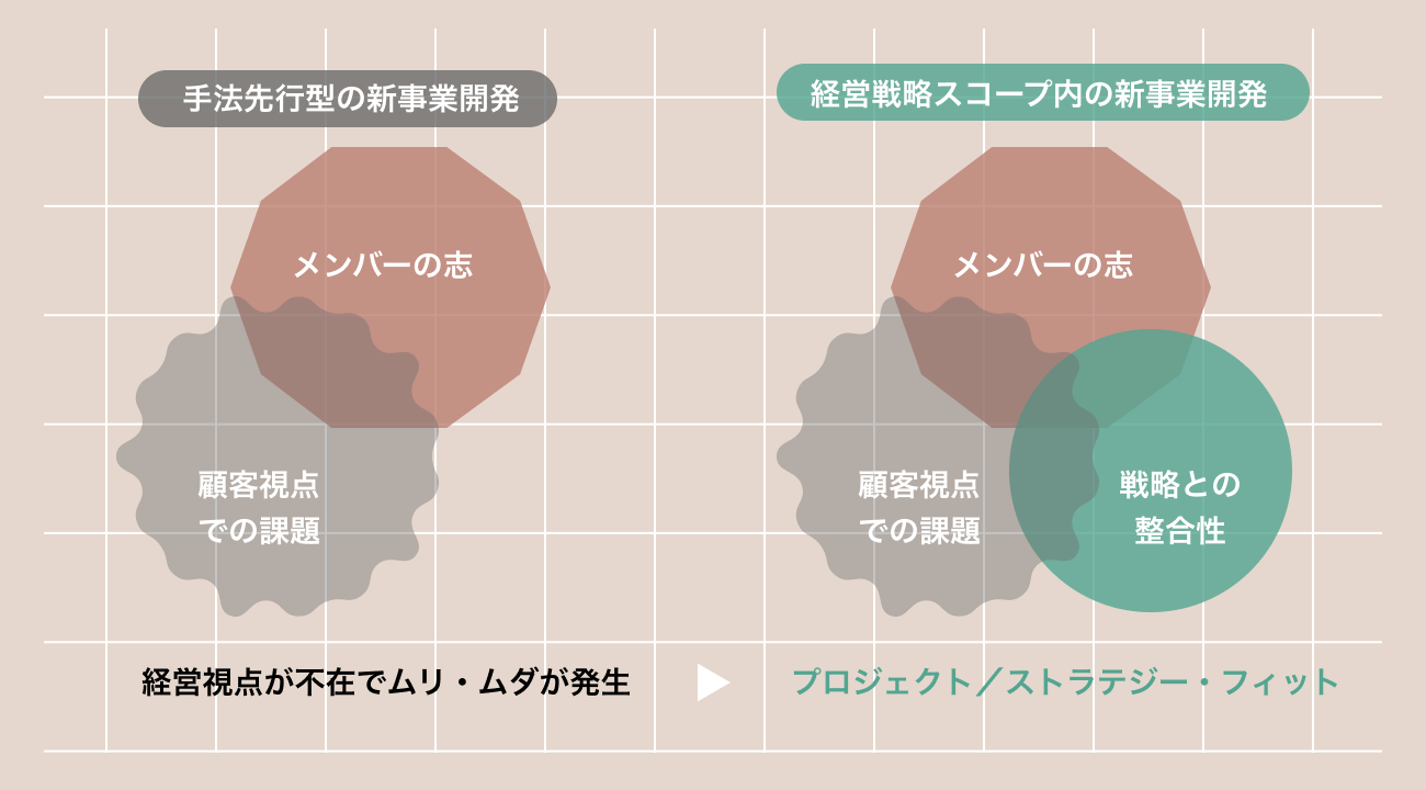 「プロジェクト/ストラテジー・フィット」は、従来の顧客視点の課題を起点とした事業開発検討を進める前に、企業経営が⾒据える事業環境の変化と課題を把握し、新規事業の開発要件を明確にします。それにより新規事業を経営、顧客の双方の課題の解決する新しい新規事業開発プロセスです。