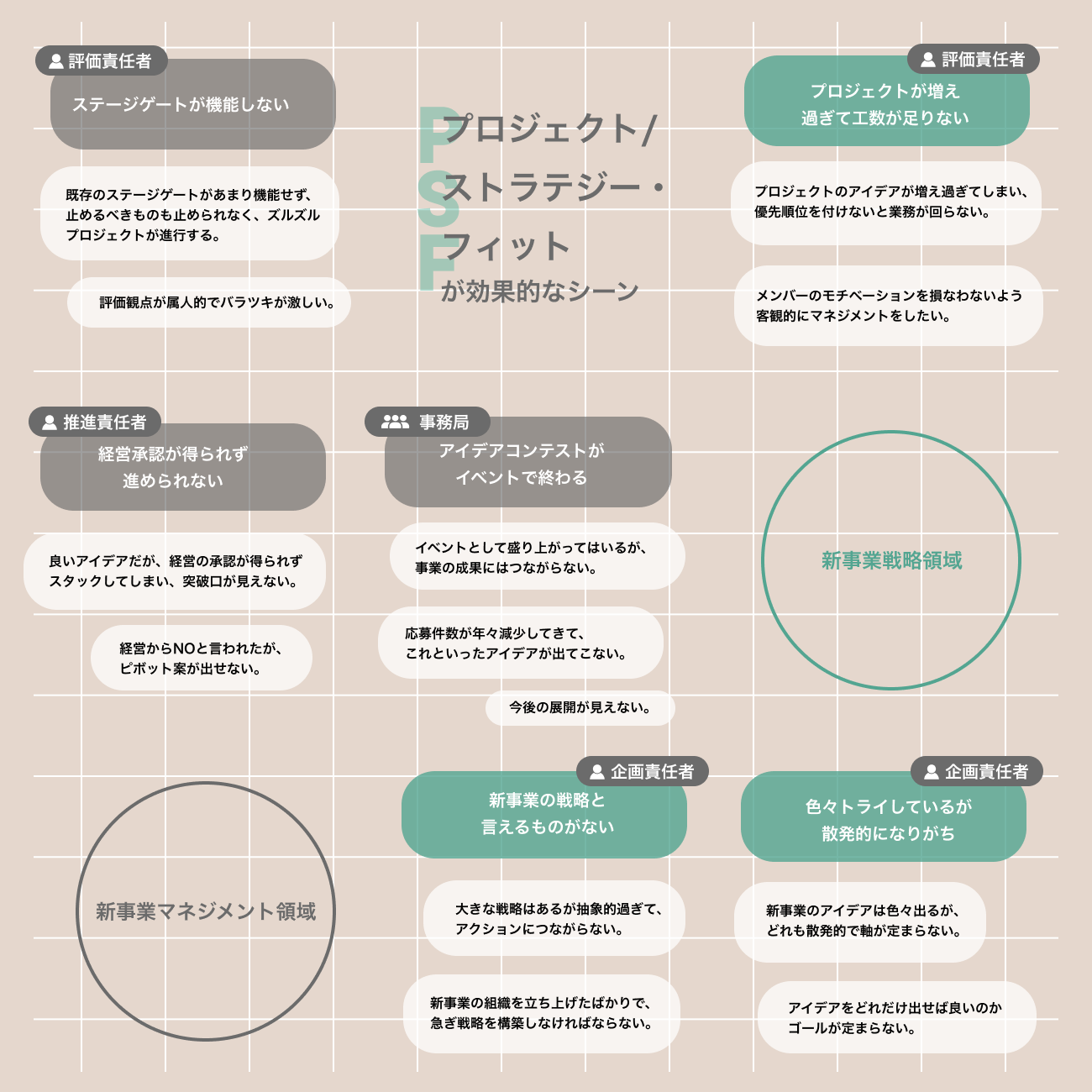個別プロジェクトオーナーやマネージャーの新規事業の経営承認が得られず停滞してしまう状況や、新規事業の⽀援をするマネジメント部⾨の明確で納得感のある判断基準がない状況を明確な新規事業開の要件・判断基準を定義することで解決します。