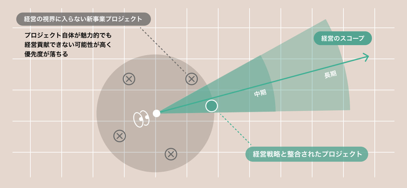 特に⼤企業の場合は様々な部⾨が新規事業を企画推進しており、個々のプロジェクトはOne of Themとなってしまいます。さらに、現状の顧客視点を中⼼とした⼿法では経営視点が不在になりがちで、多くのプロジェクトは経営戦略のスコープから外れて検討してしまっており、その結果、経営からの承認や⽀援が得られずプロジェクトが頓挫してしまっています。つまり、⼤企業においては、顧客起点での新規事業の検討プロセス⾃体に課題があるため積極的に投資しているにも関わらずムダ・ムラが多く発⽣してうまくいっていないと考えられます。