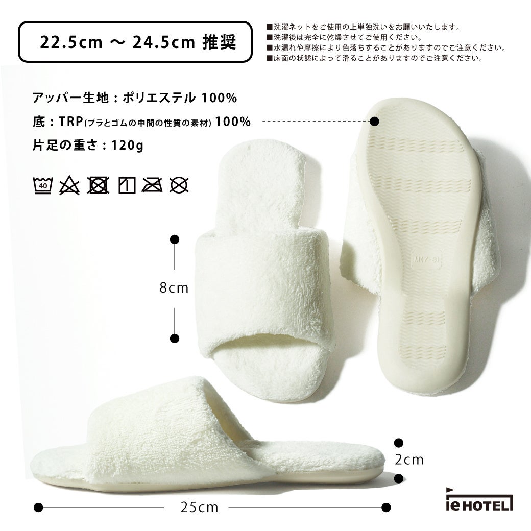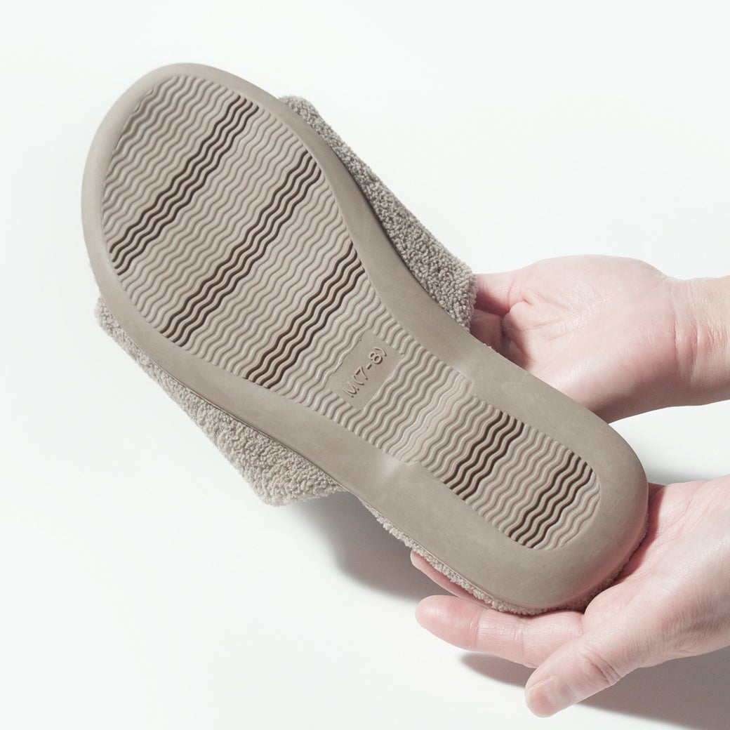 肌にあたる面がタオル地に包まれていますので履き心地が柔らかく快適です。また、底面は、外でも履けるように汚れにくく、お手入れのしやすいTRPというプラスチックとゴムの中間の性質の素材が使われております。屋上やバルコニーでのBBQ、プールサイド等のレジャーにもおすすめです。