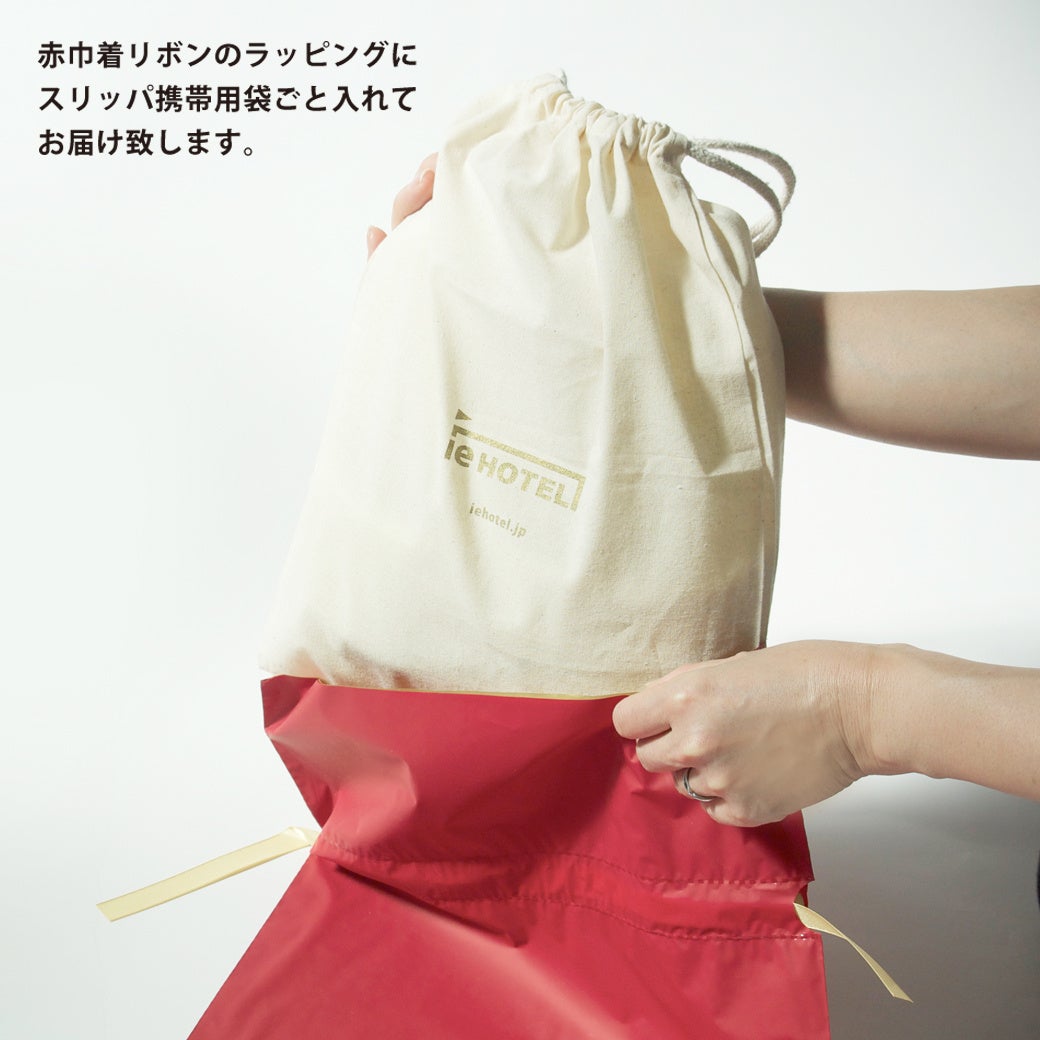 そして、「家をホテルに ホテルを家に」するブランド 「ie HOTEL」のオリジナルオーガニック巾着バックの中に、タオル地スリッパを入れました。是非、旅行や外出時にもご利用いただけると嬉しいです。さらに母の日のプレゼントとして最適な赤巾着リボン袋でラッピングしてお届けします!
