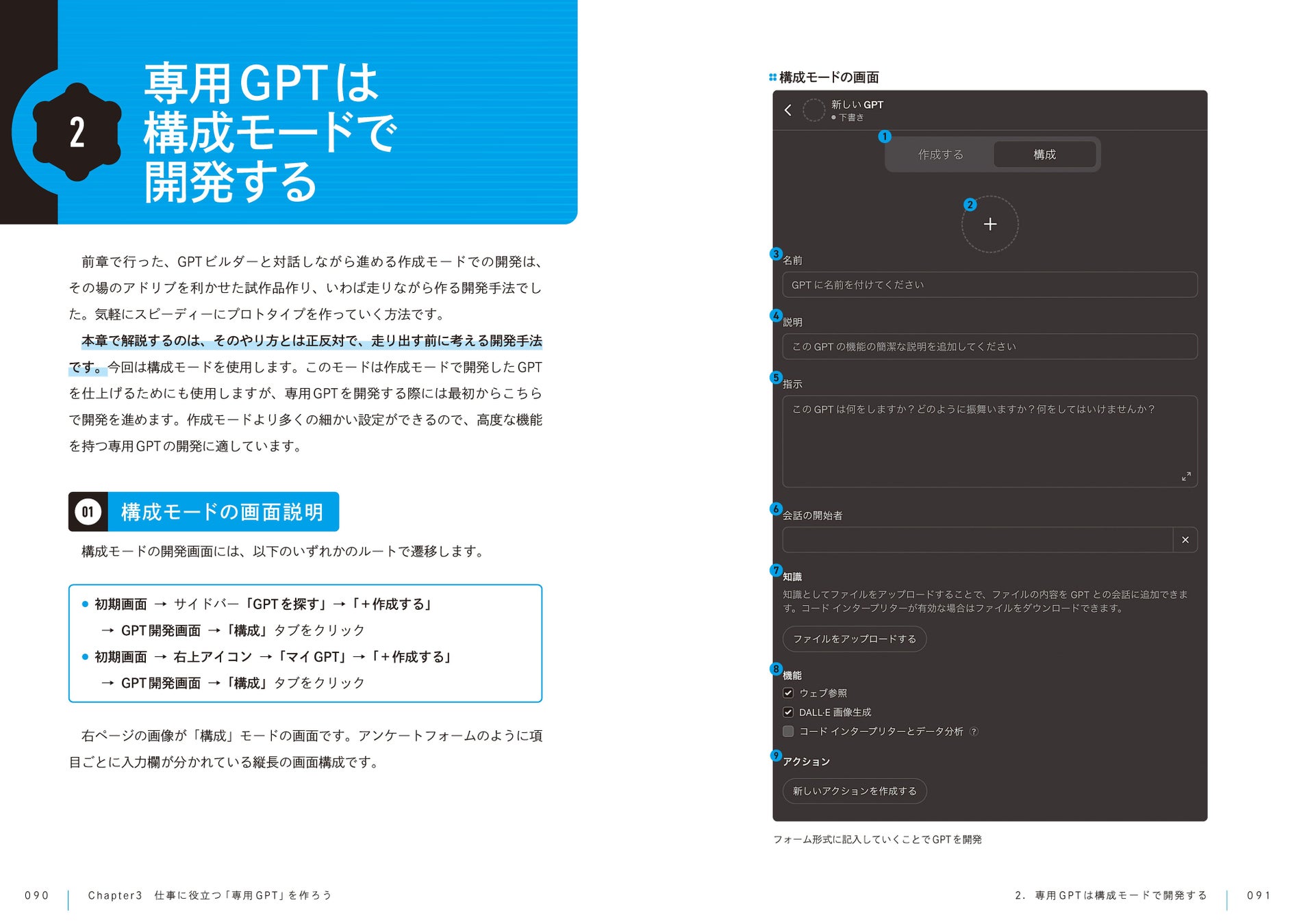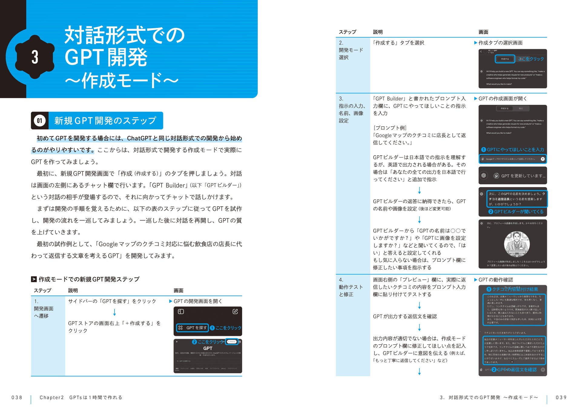 本書ではGPTsを開発する2つの方法、そして短時間で実用的なGPTsを作り出す流れを学び、練習として豊富に掲載されている作成用のプロンプトとともに、実際に短時間でGPTsを開発するノウハウを、どこよりもわかりやすく詳しく解説していきます。