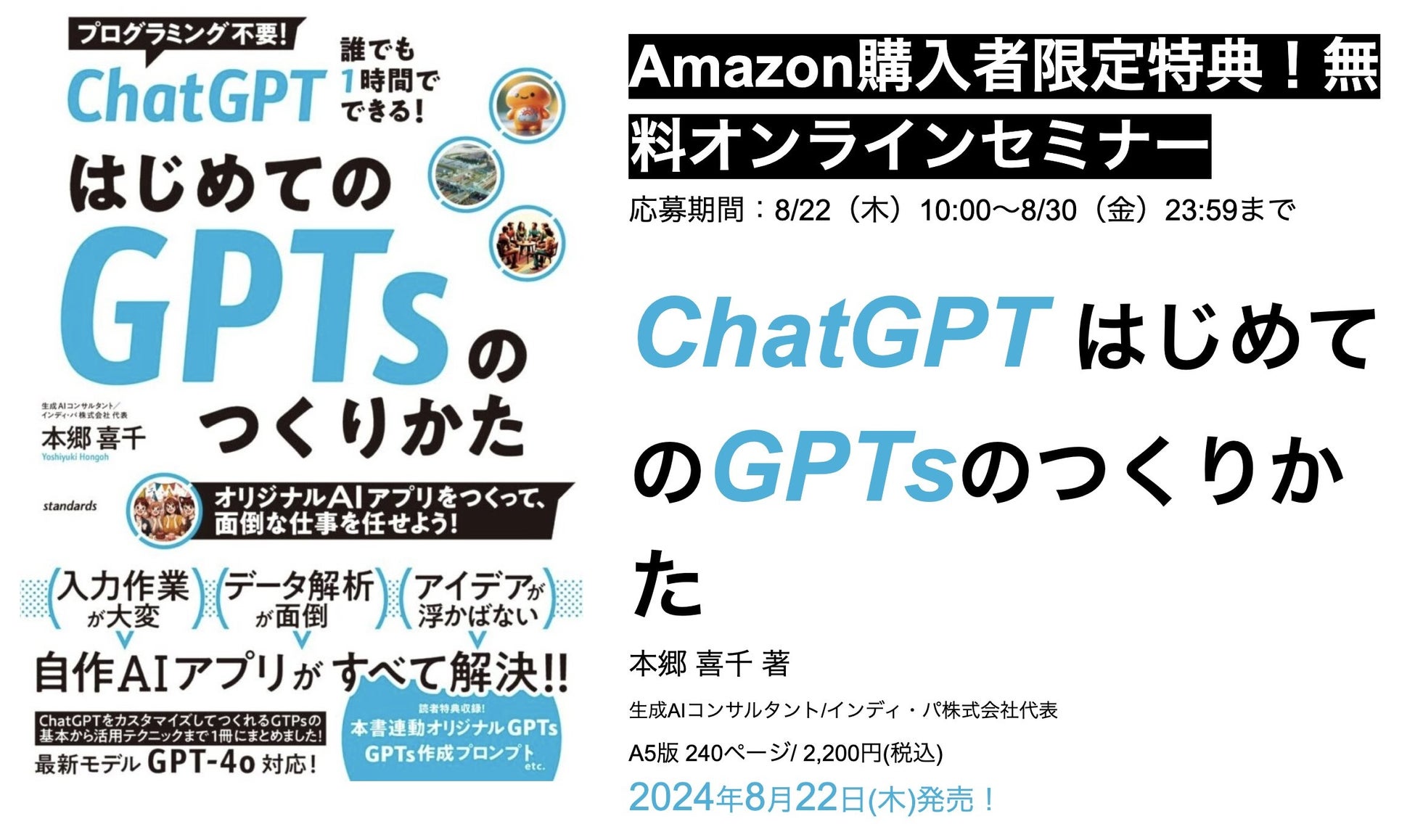 キャンペーン期間限定で、著者によるGPTs特別オンラインセミナーを無料で受講できます。